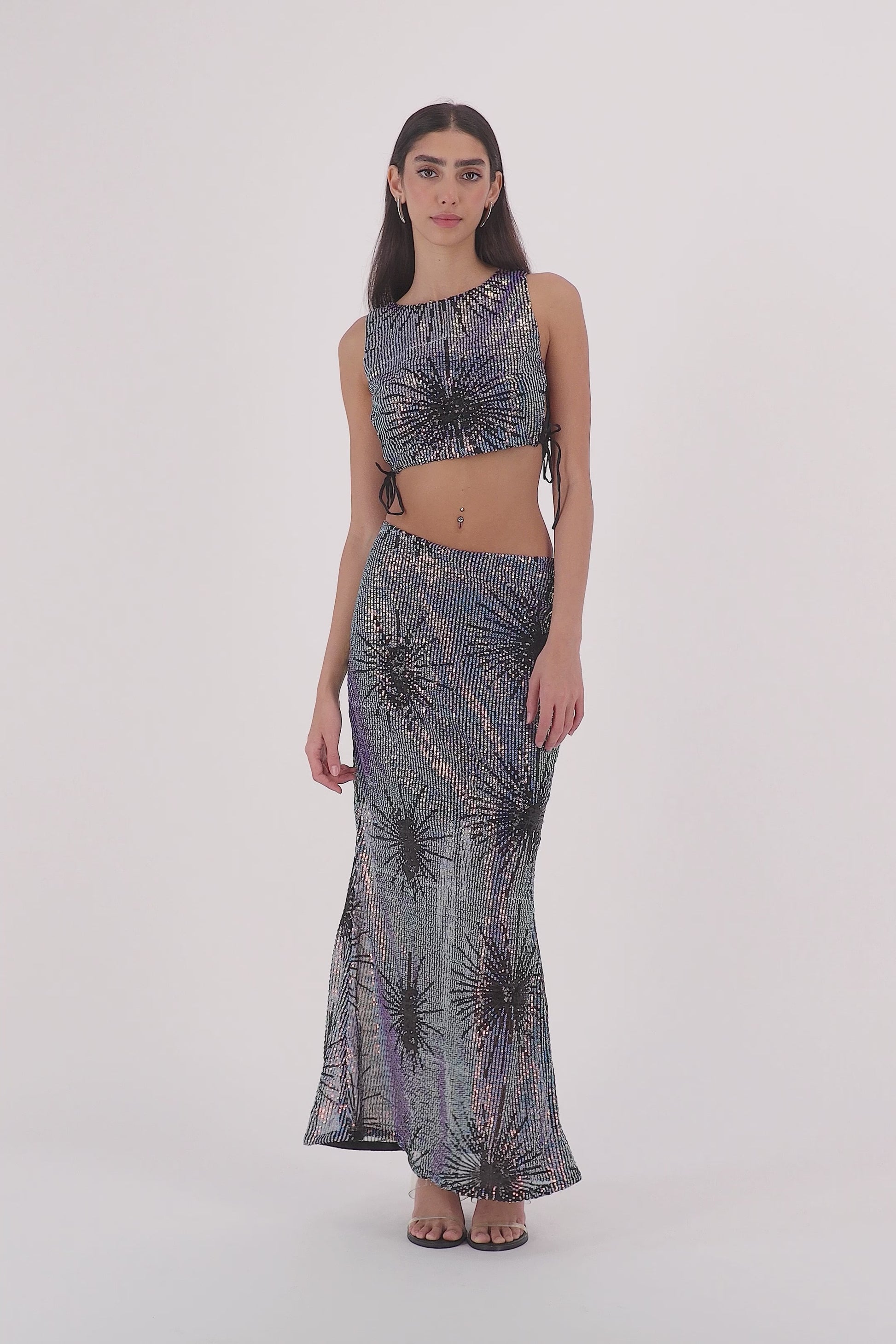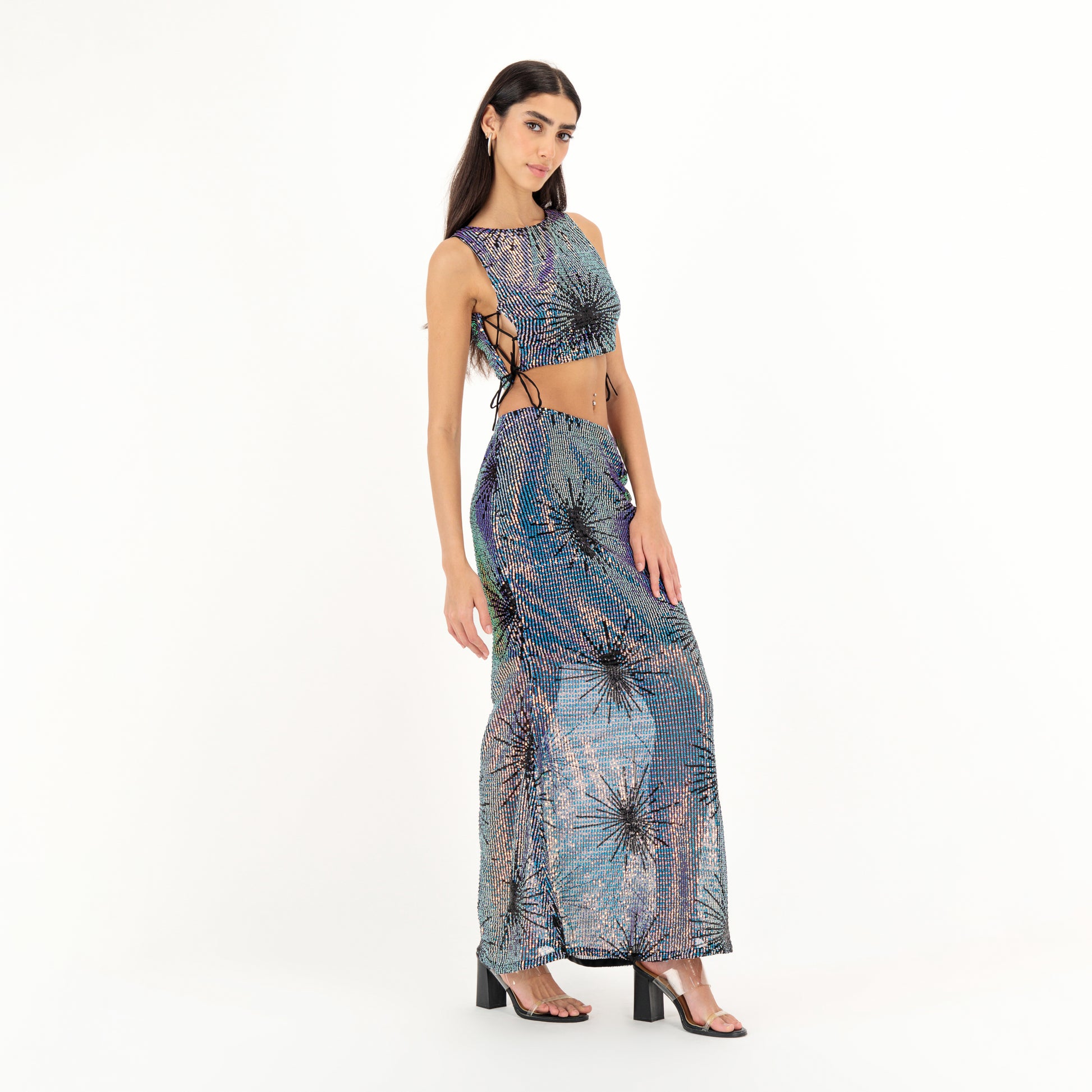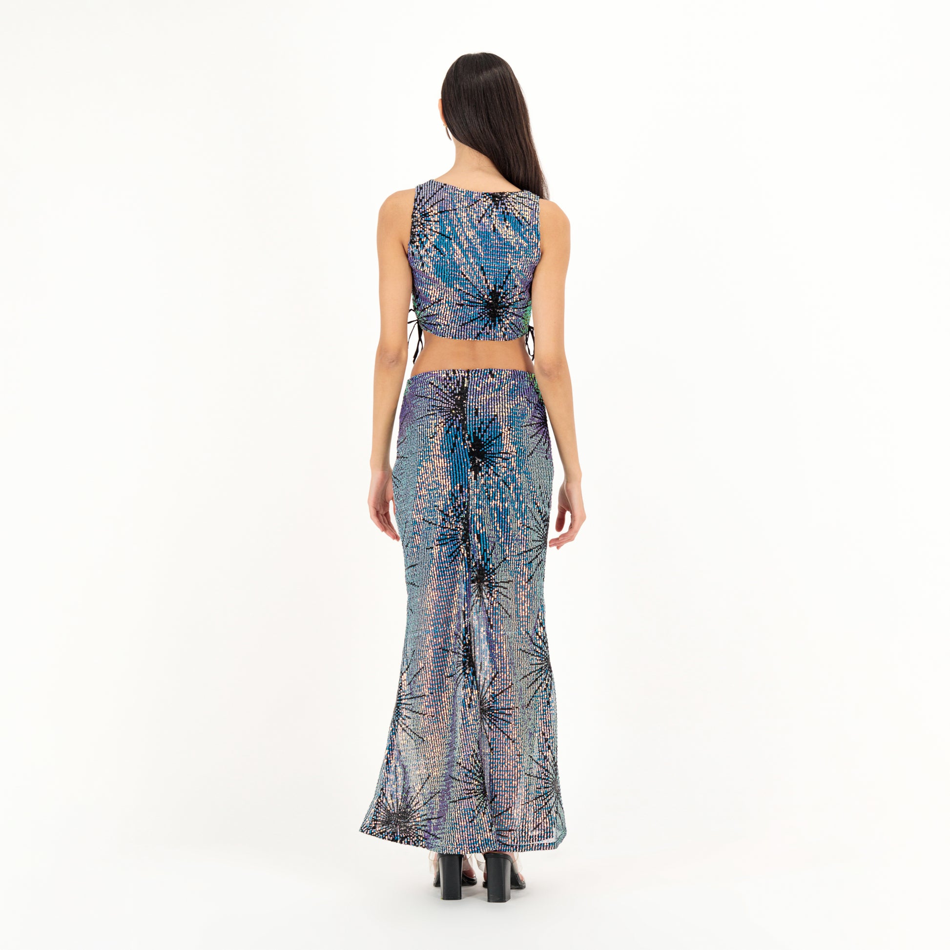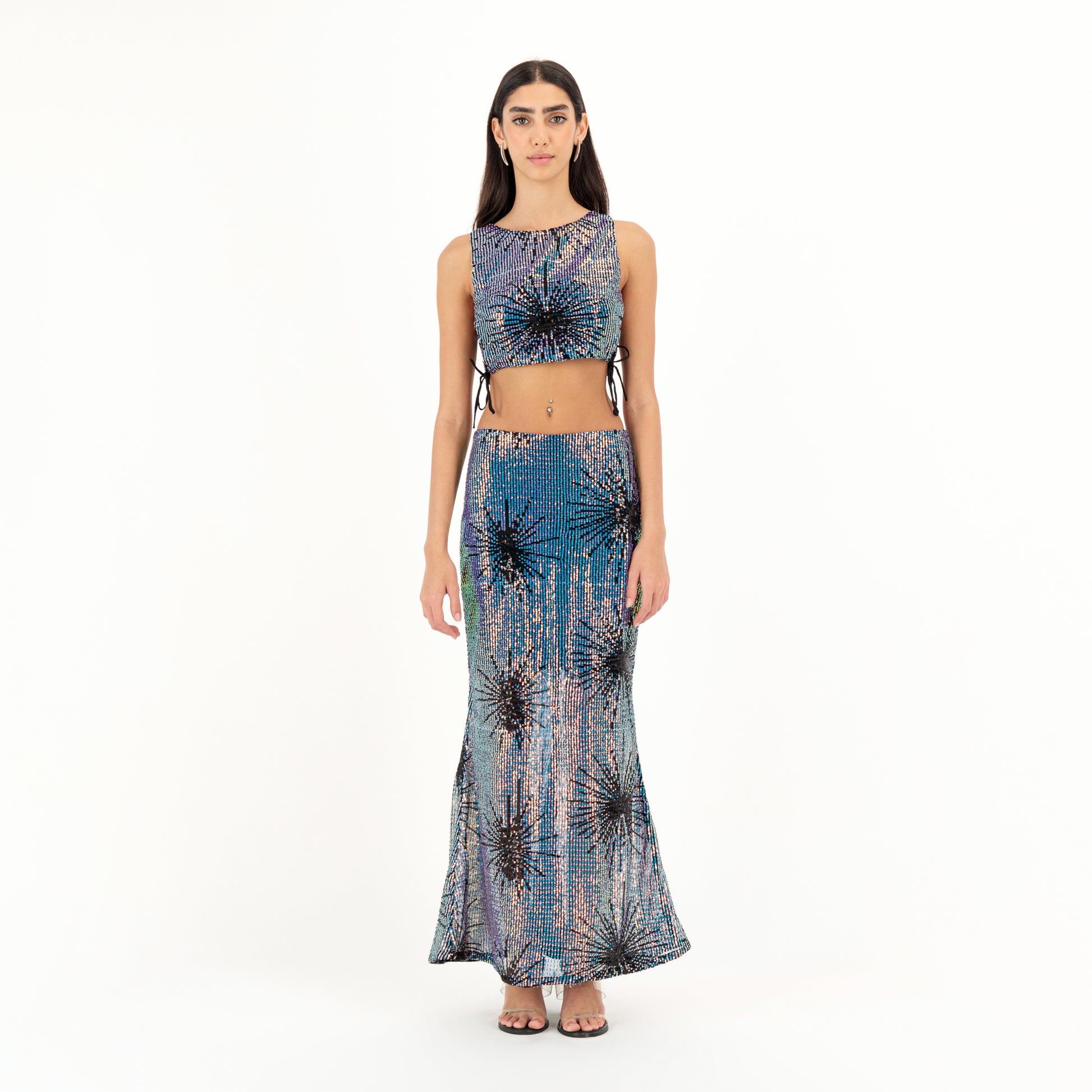 Introducing our stunning Mermaid-Inspired Ariel Sequin Skirt! This captivating skirt is designed to hug your curves until the knees, where it flares out for easy movement. The iridescent sequin fabric shimmers beautifully when it catches the light, creating a magical effect.