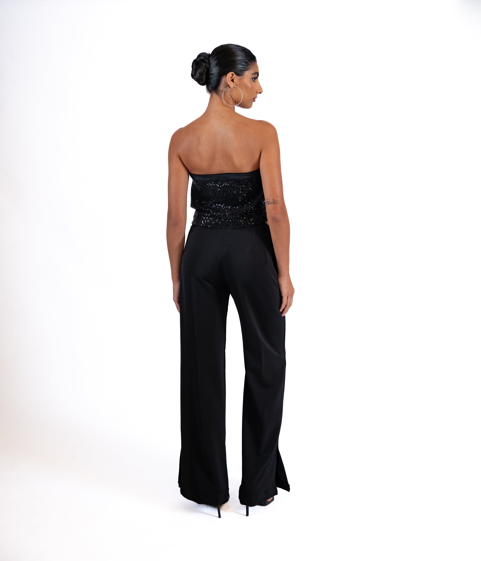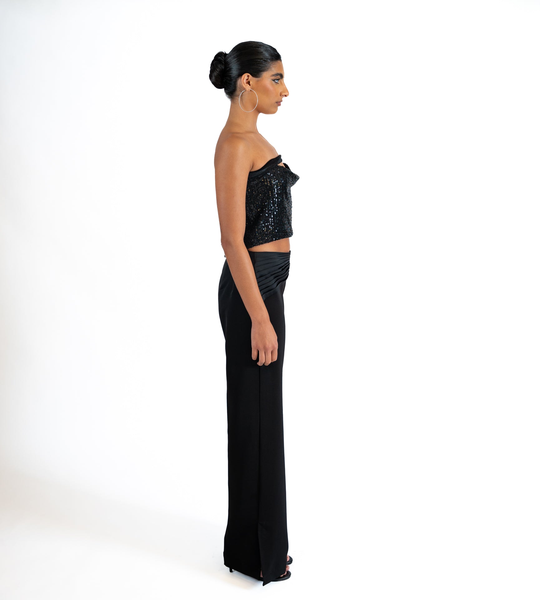 The Eclipse Sequin Top captures the essence of dazzling winter nights. This strapless bandeau features shimmering black sequins creating a glamorous yet understated look. Perfect for sultry evenings, pair it with wide-leg pants or a sleek skirt to channel effortless elegance.