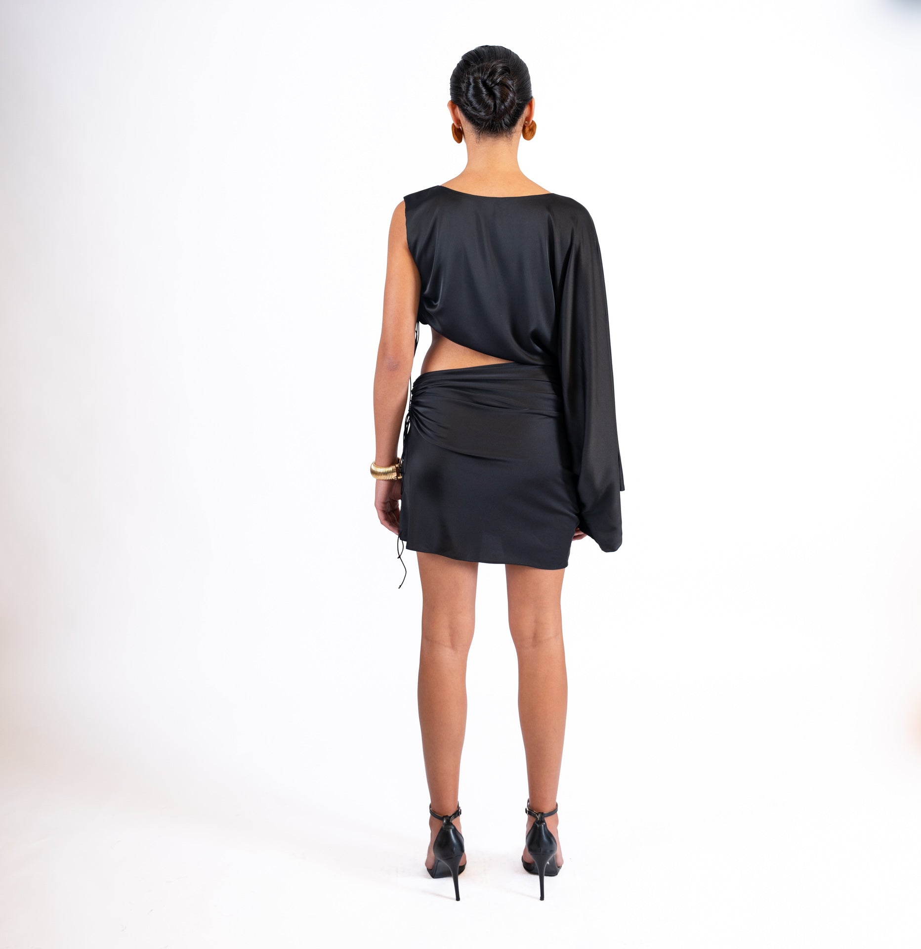 The Rae Satin Set is a modern, flowy satin two-piece designed for effortless style and versatility. The asymmetric top features soft ruching tied at the side, adding subtle texture and shape, while the coordinating skirt mirrors the ruching detail for a flattering, adjustable fit. This set is perfect for evenings that call for understated elegance with a hint of edge. Pair it with strappy heels and statement jewelry to complete the look.