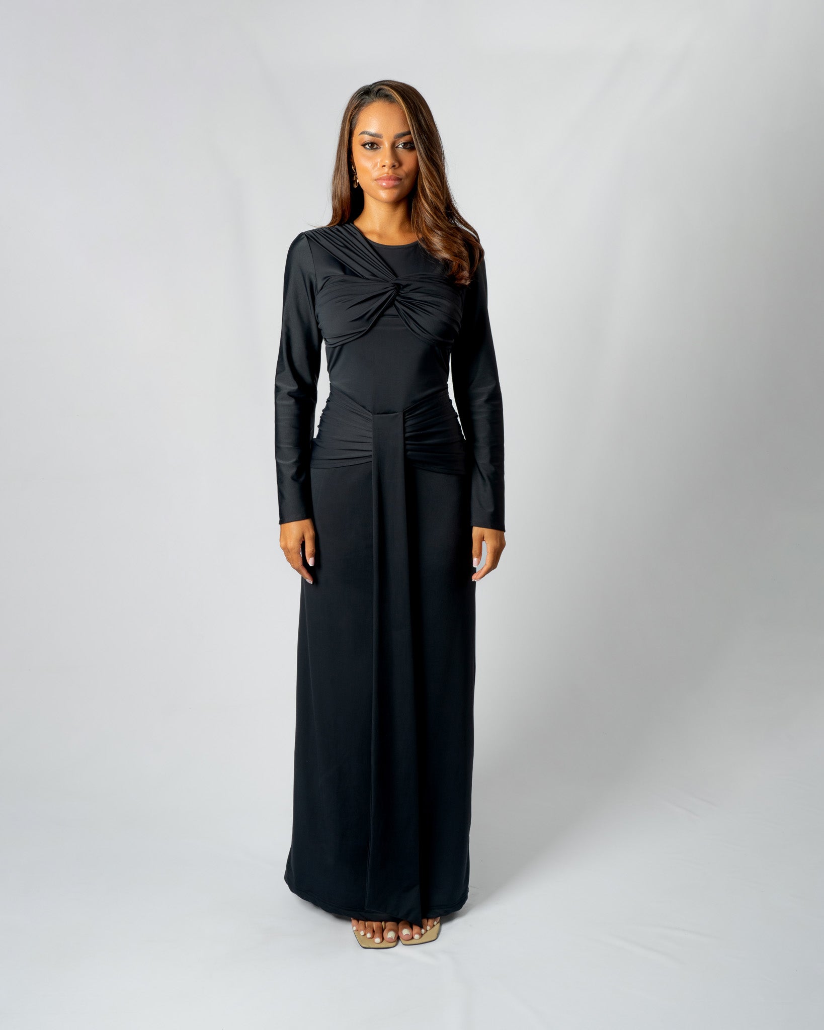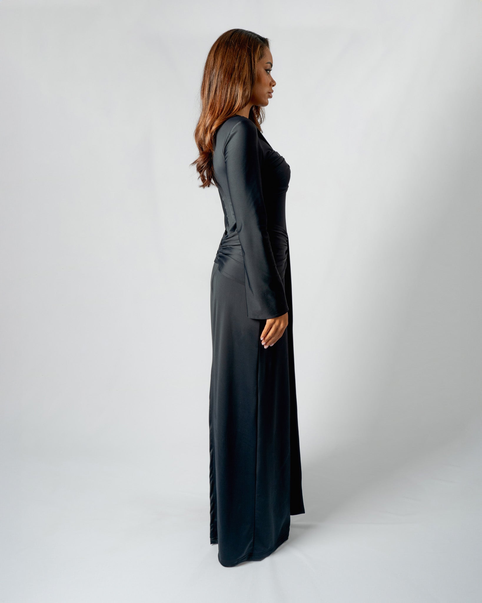A long-sleeve dress adorned with fixed gathered draped details around the chest and hips area to give off that snatched body illusion. Complete with a zipper on the center back seam and a slit on the back, it exudes both elegance, comfort and functionality.