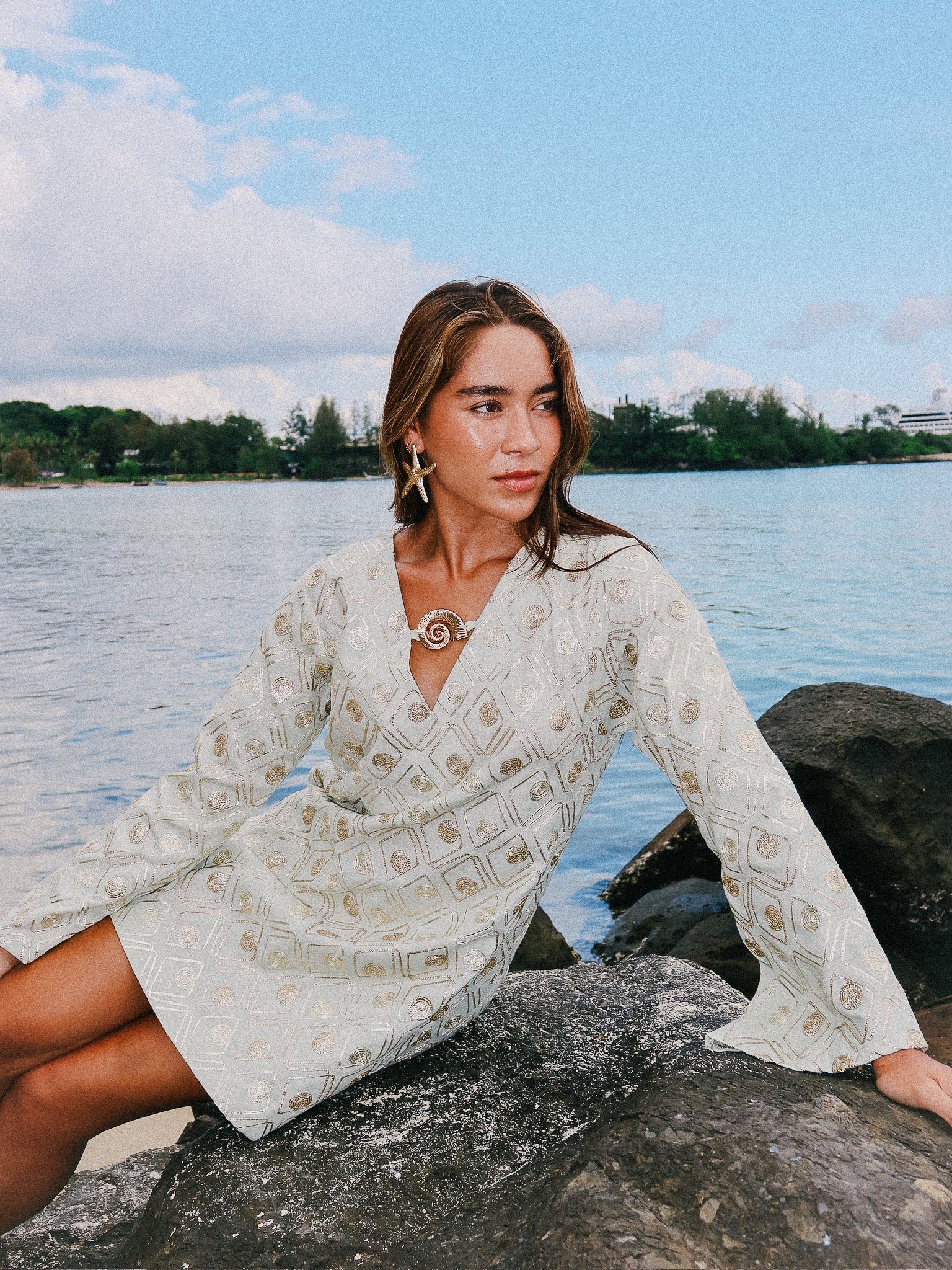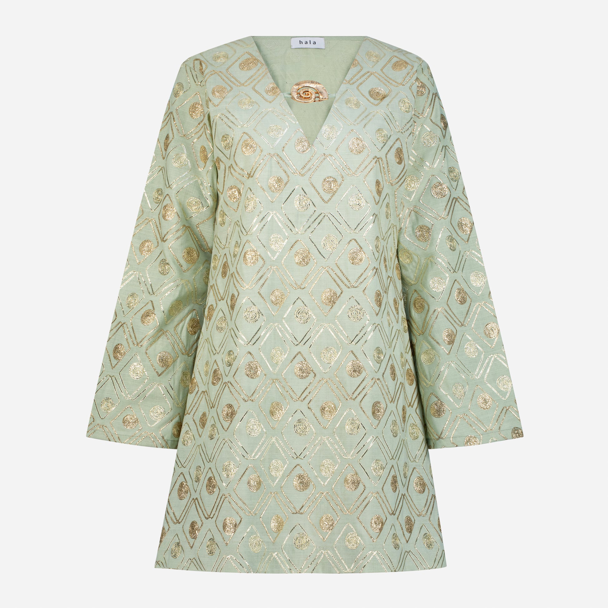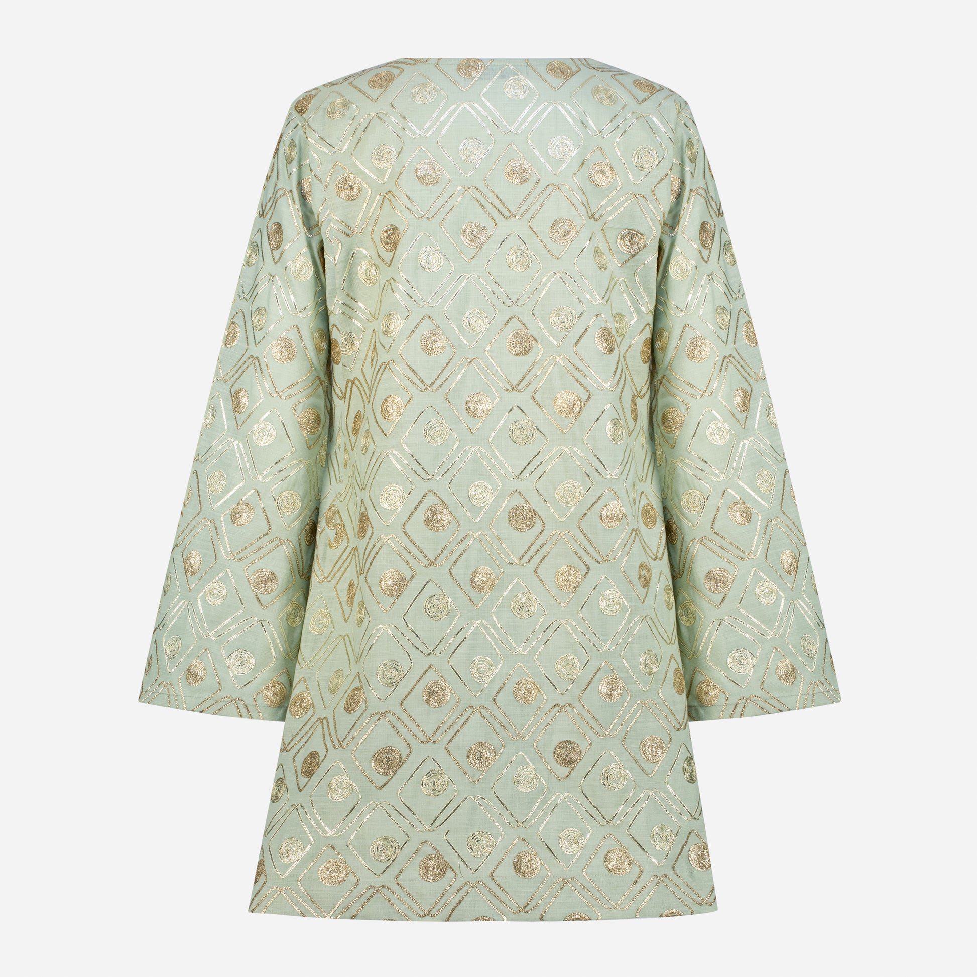 The KANYA Dress is crafted from 100% linen and embroidered with delicate gold thread. This short dress captures the dance of moonlight in still water. The deep V neckline is framed by our lotus ring symbolizing purity and strength while the softly flared sleeves echo the slow grace of the lotus bloom.