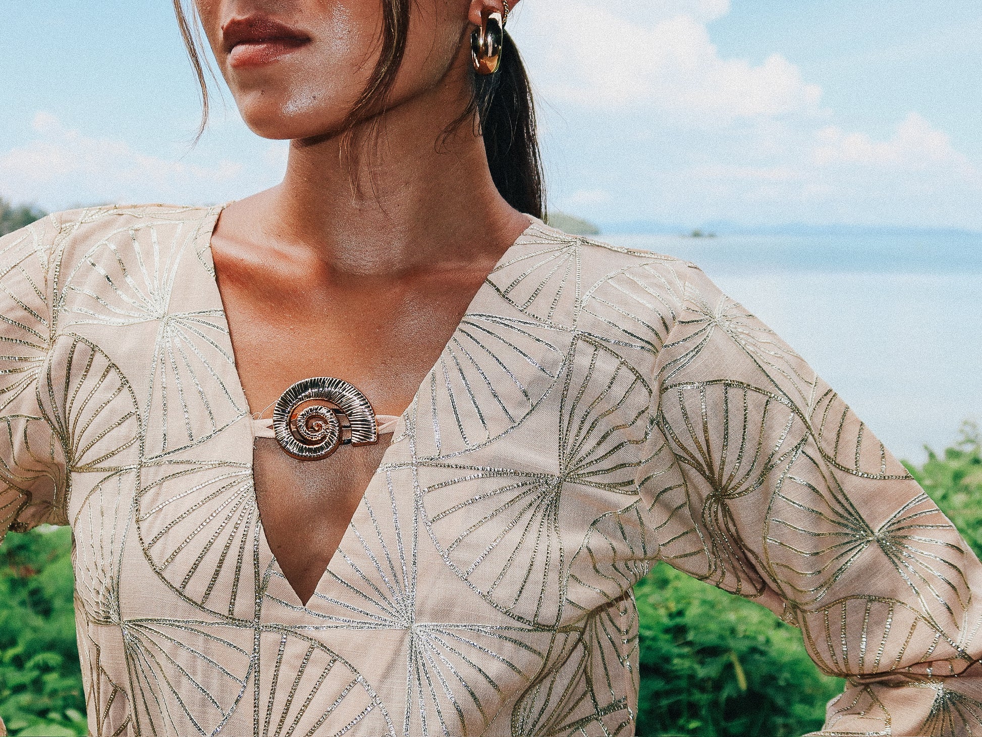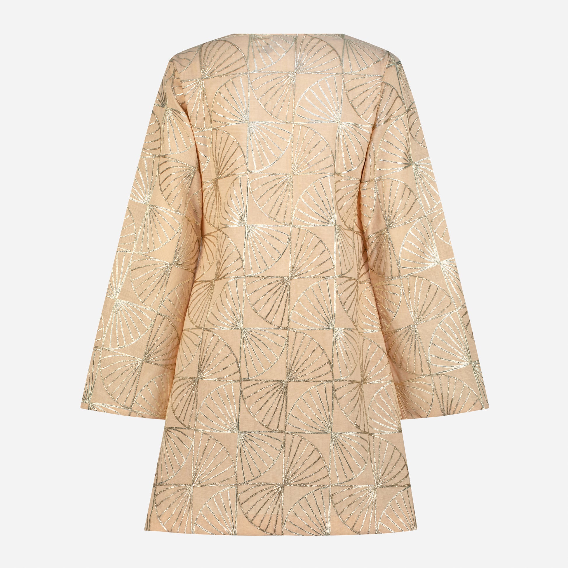 The KANYA Dress is crafted from 100% linen and embroidered with delicate gold thread. This short dress captures the dance of moonlight in still water. The deep V neckline is framed by our lotus ring symbolizing purity and strength while the softly flared sleeves echo the slow grace of the lotus bloom.