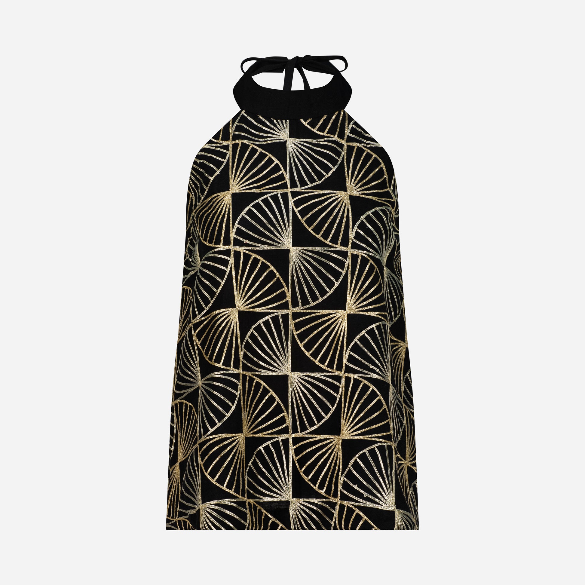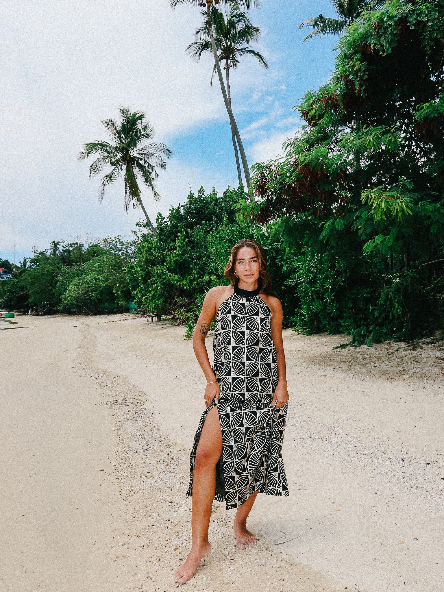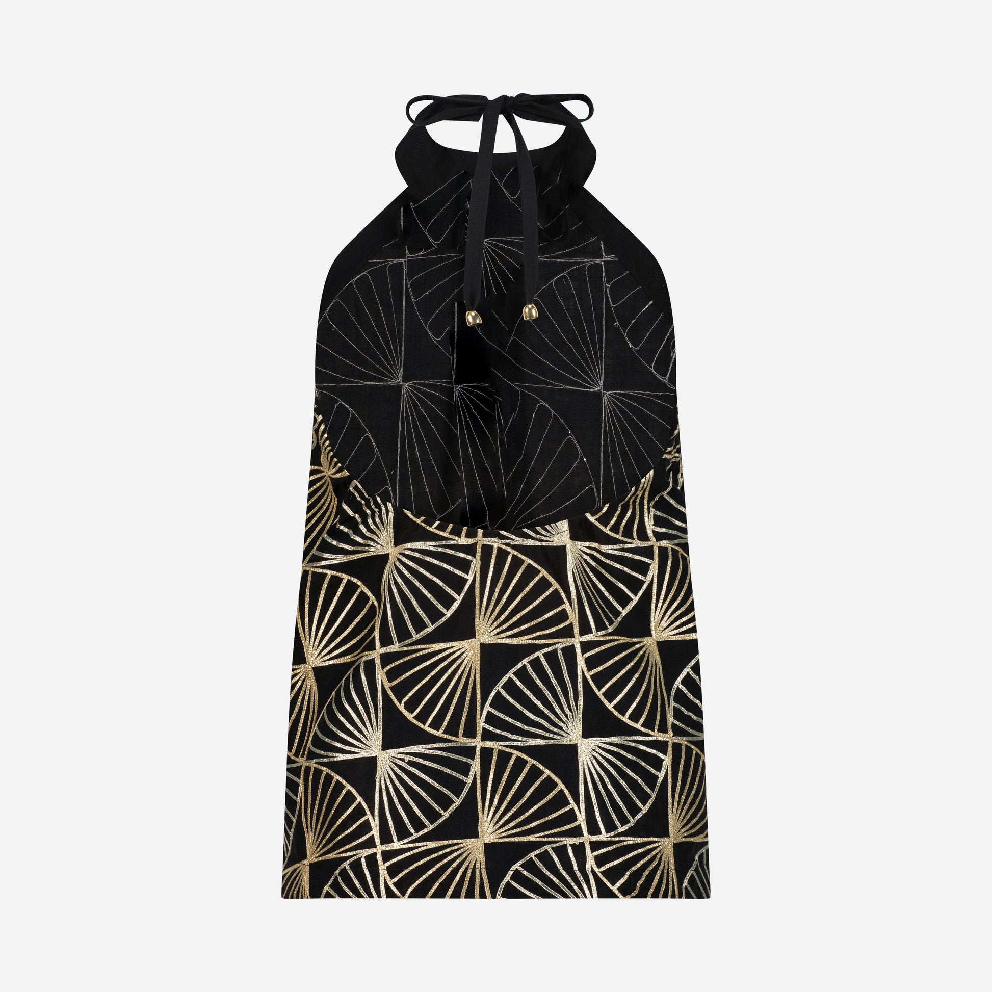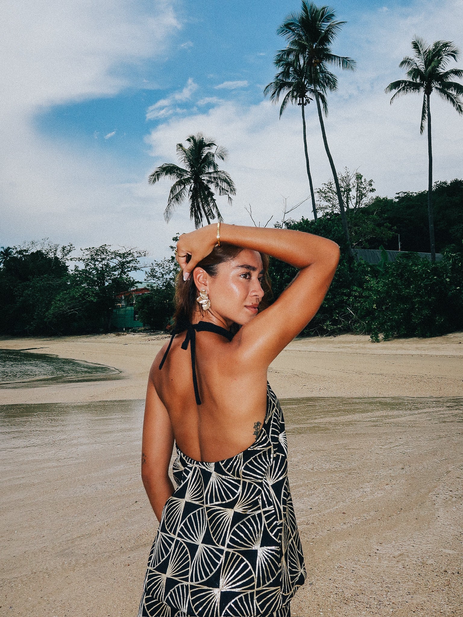 The LAMAI top is where soft structure meets tropical soul. Cut in 100% pure linen and golden embroidery this halter silhouette has an A line cut.