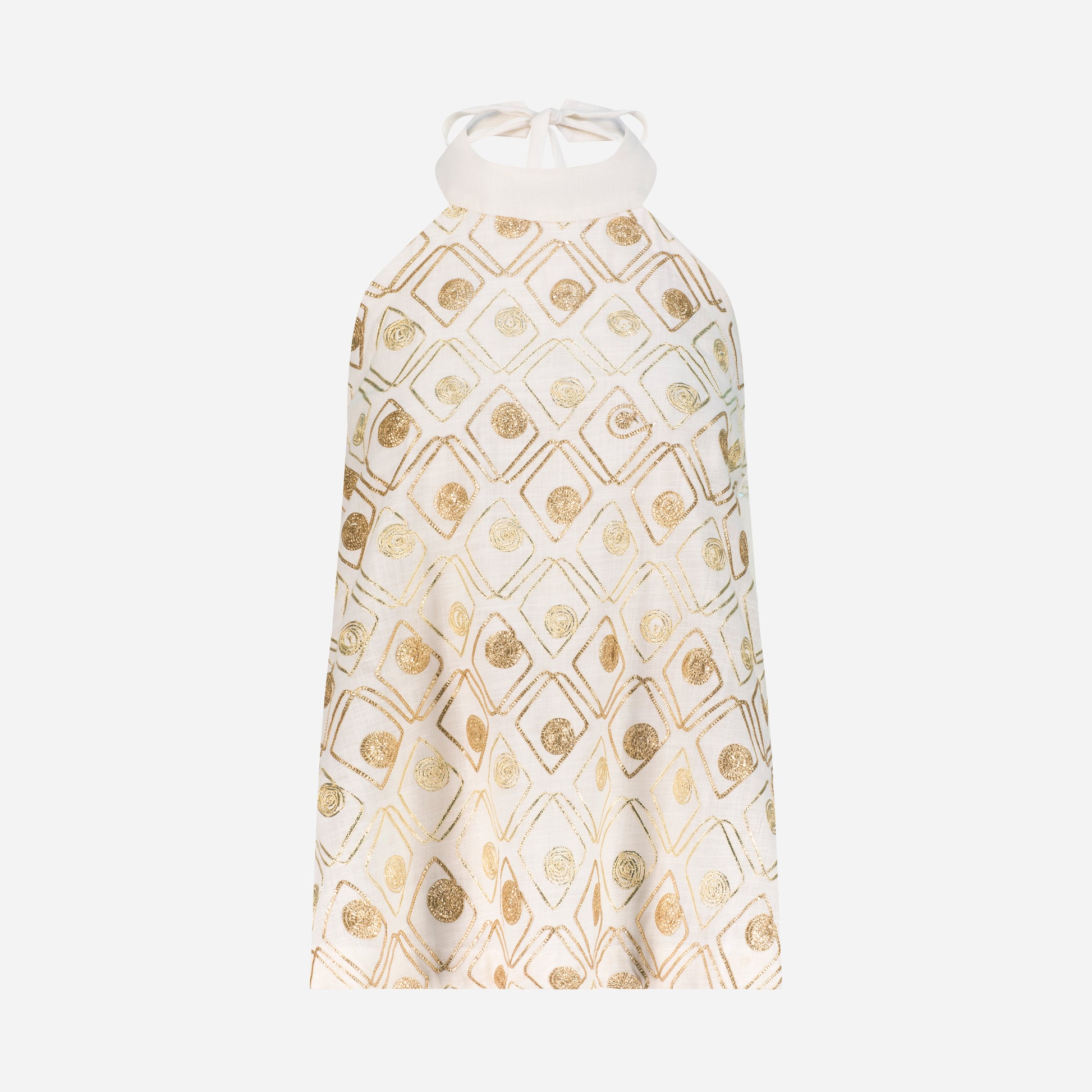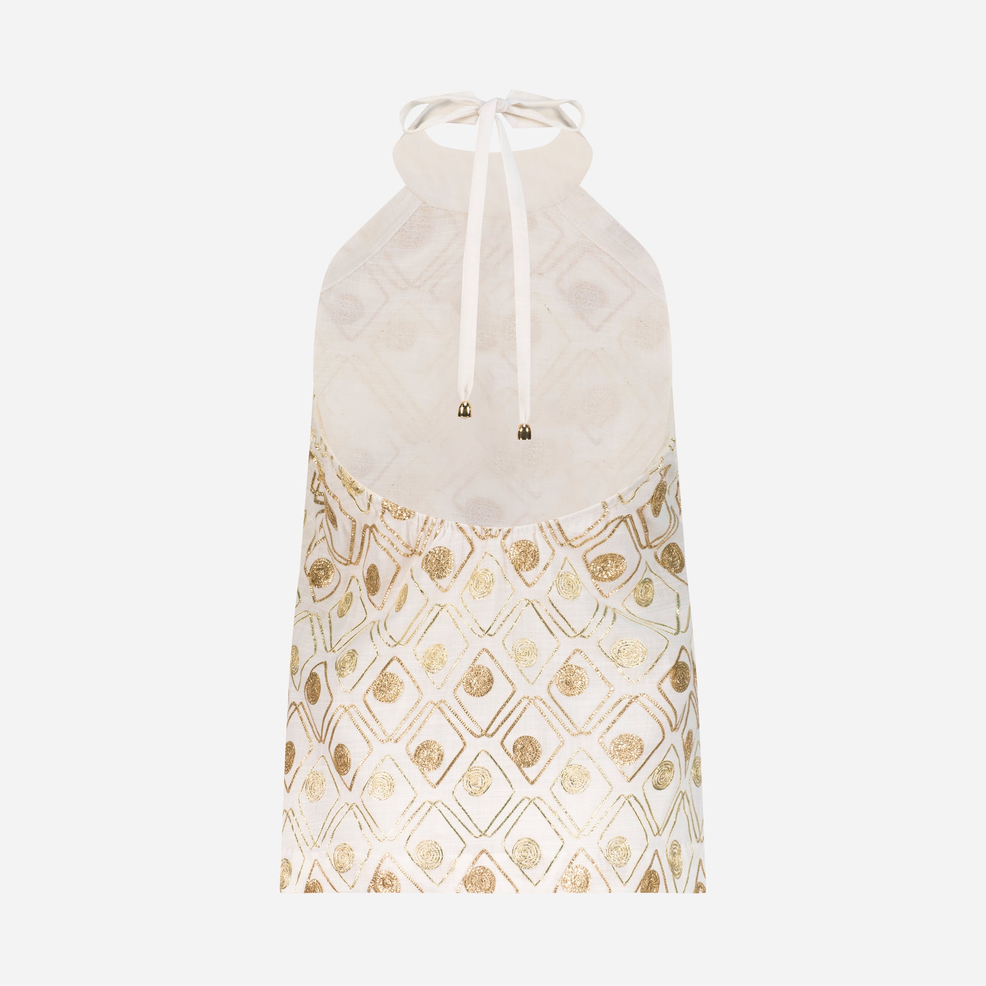 The LAMAI top is where soft structure meets tropical soul. Cut in 100% pure linen and golden embroidery this halter silhouette has an A line cut.