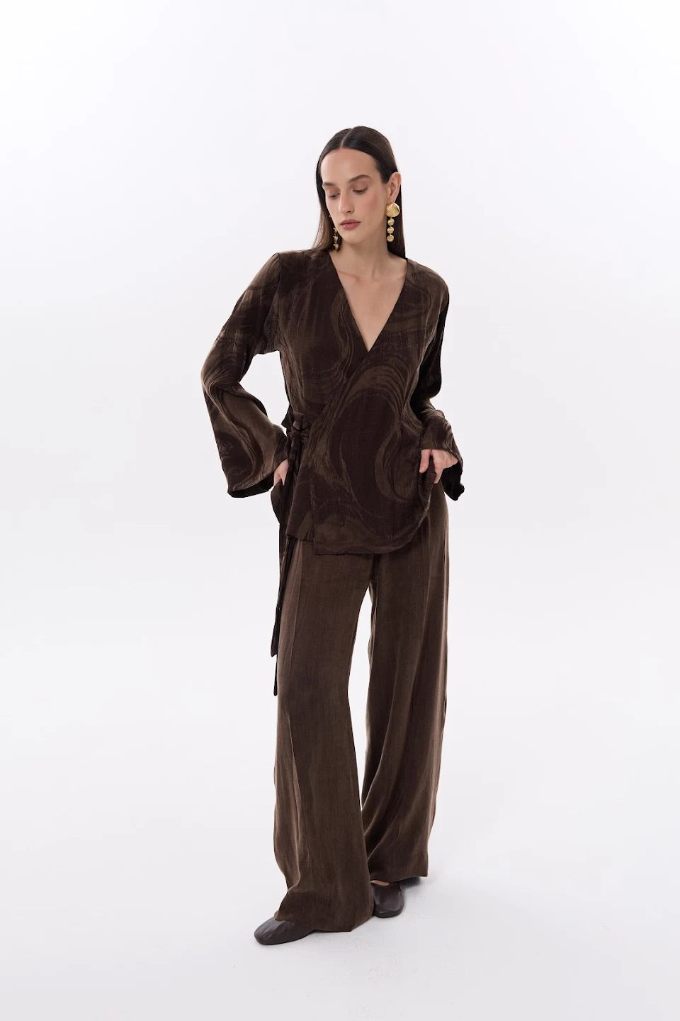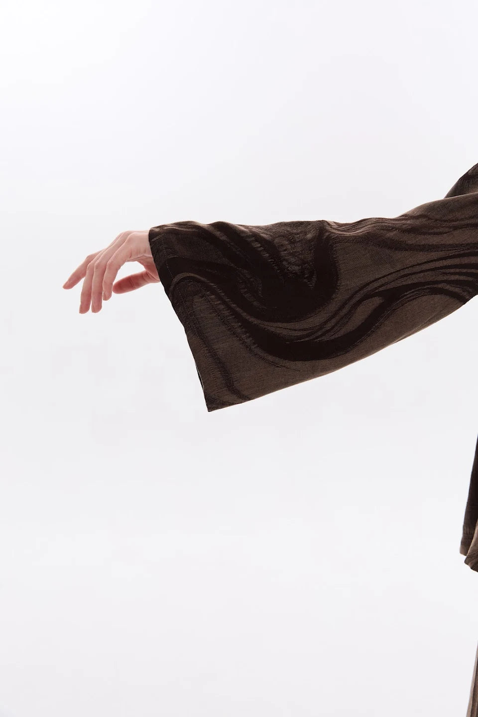 The Layan Kimono Jacket is defined by softness and flow. Cut in a relaxed kimono silhouette, it drapes fluidly over the body, creating an effortless layer that feels light yet refined. Crafted from cupro viscose, the fabric has a smooth, breathable finish with a subtle sheen that moves beautifully with every step.