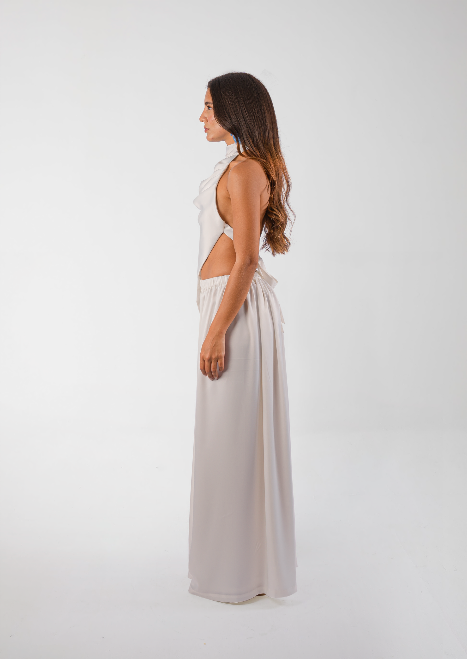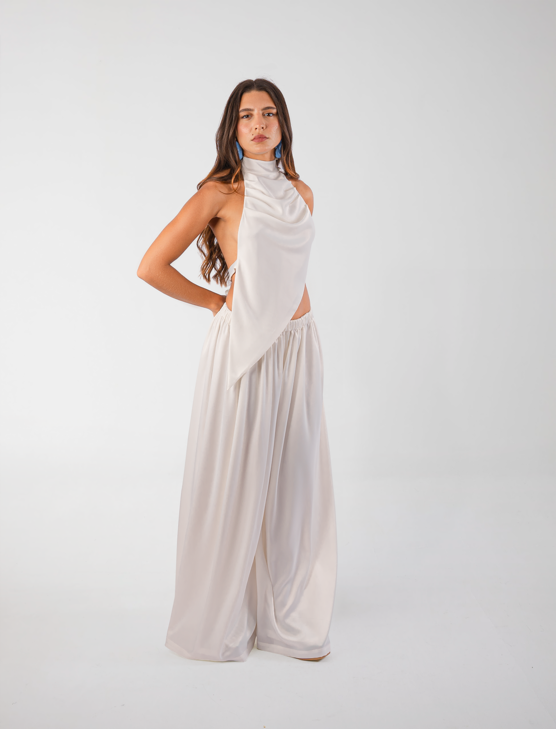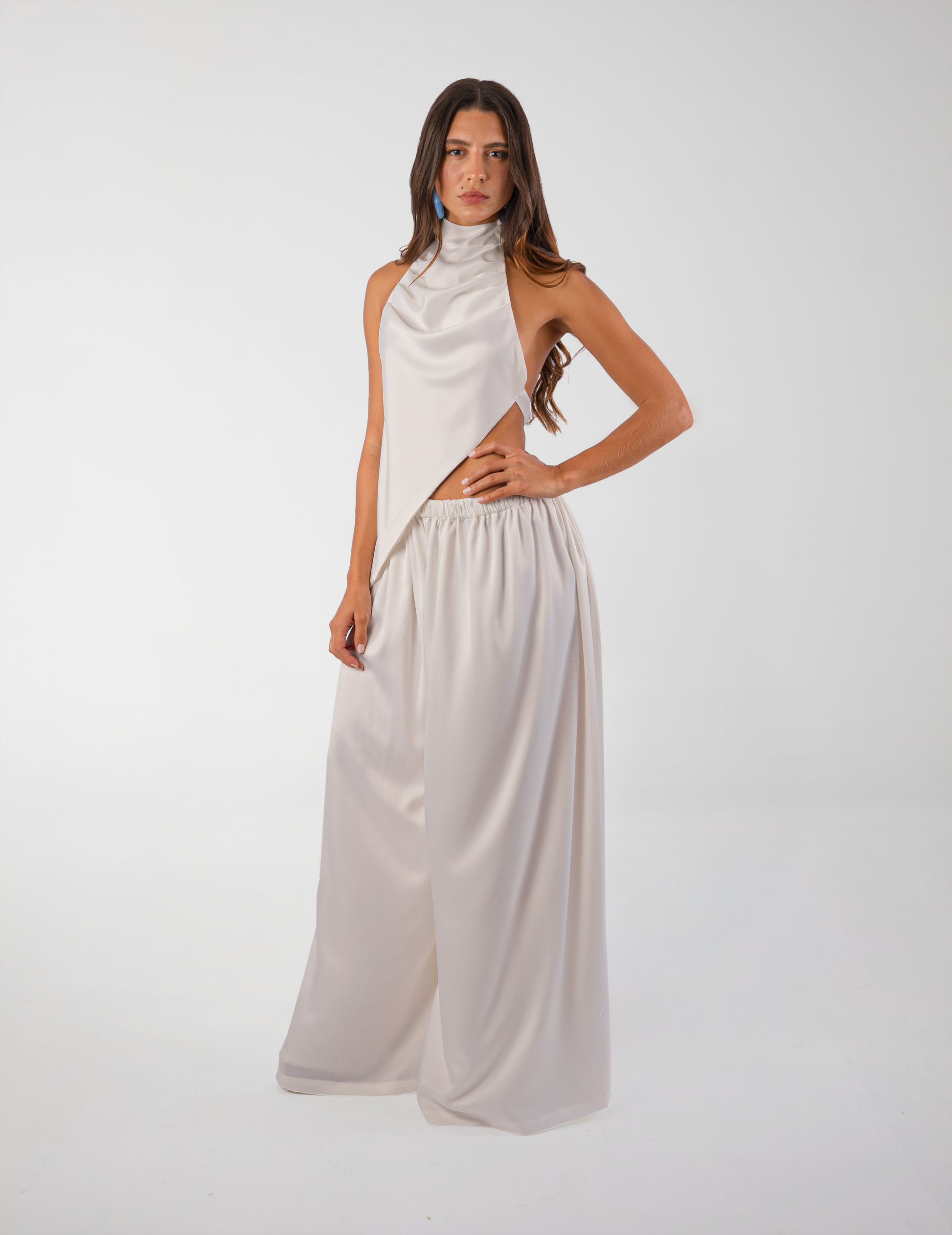This elegant satin top has an asymmetrical hem, a crawl neck with two buttons for closure and it is tied from the back.