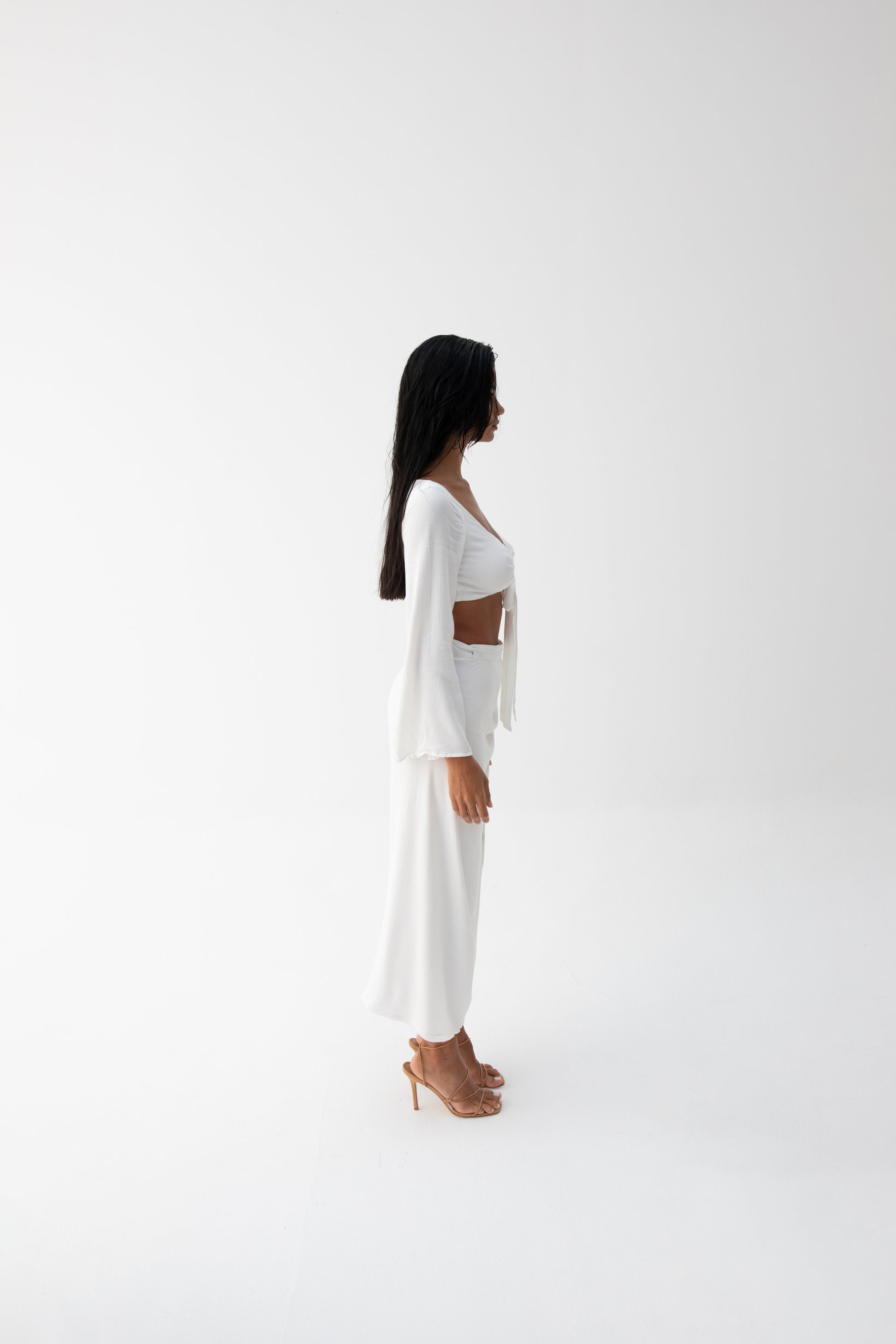 Crop top with oversized long sleeves. Perfectly paired with the Lou Lou wrap skirt. The top is lined everywhere except for the sleeve to keep it breezy yet secure enough to wear braless. The tied closure detail at the front is perfect to help you adjust it according to how tight you want it to fit. It’s a sweet vibe top that works well with skirts and jeans! The finishing is French line seams.