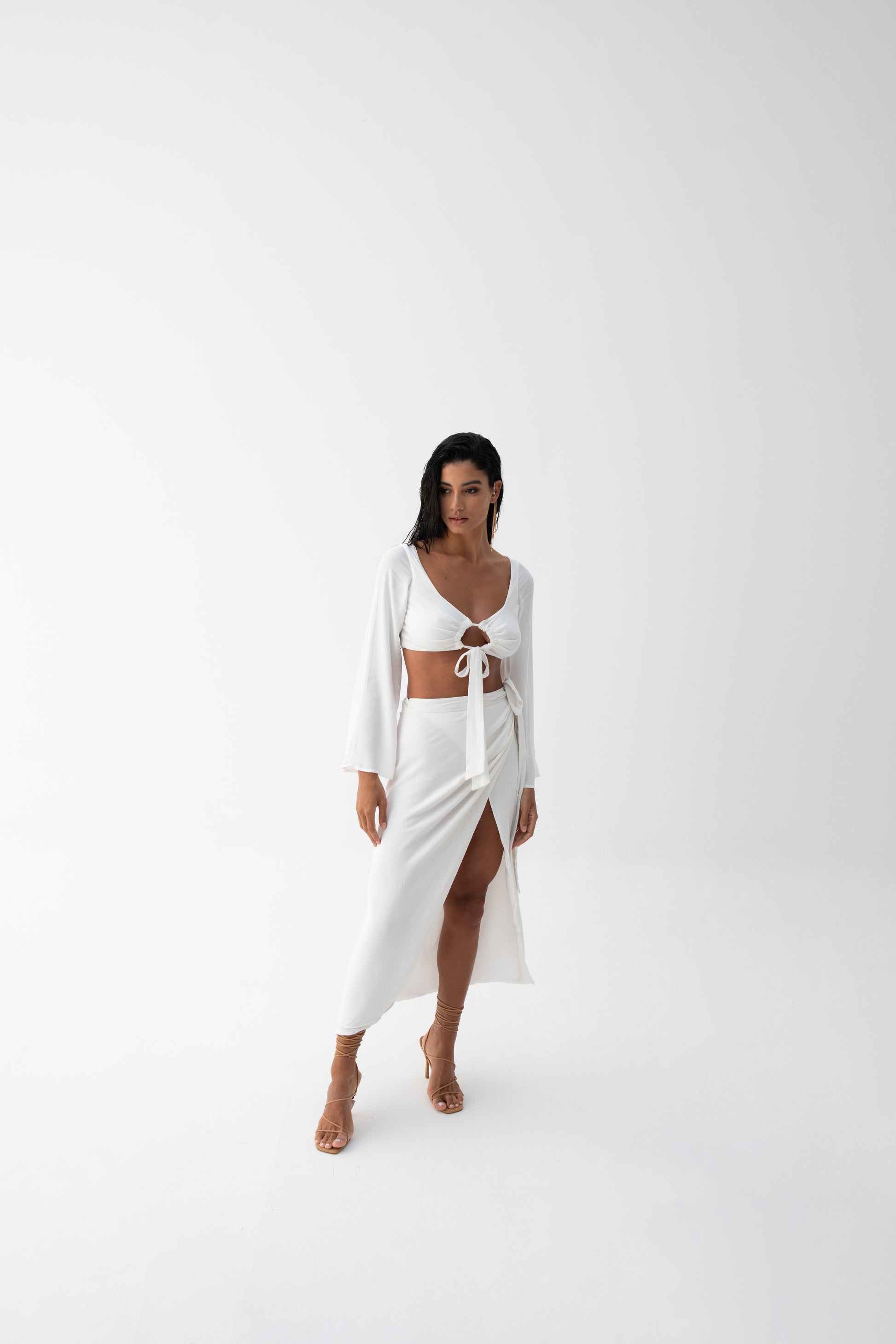 The Lou Lou wrap skirt is a wardrobe staple with its pleated details on one side. Best paired with the Lou Lou top or any simple top/crop top that won’t take away from the details of the skirt. The wrap skirt is lined with an adjustable waistband so you can tie it to your liking.
