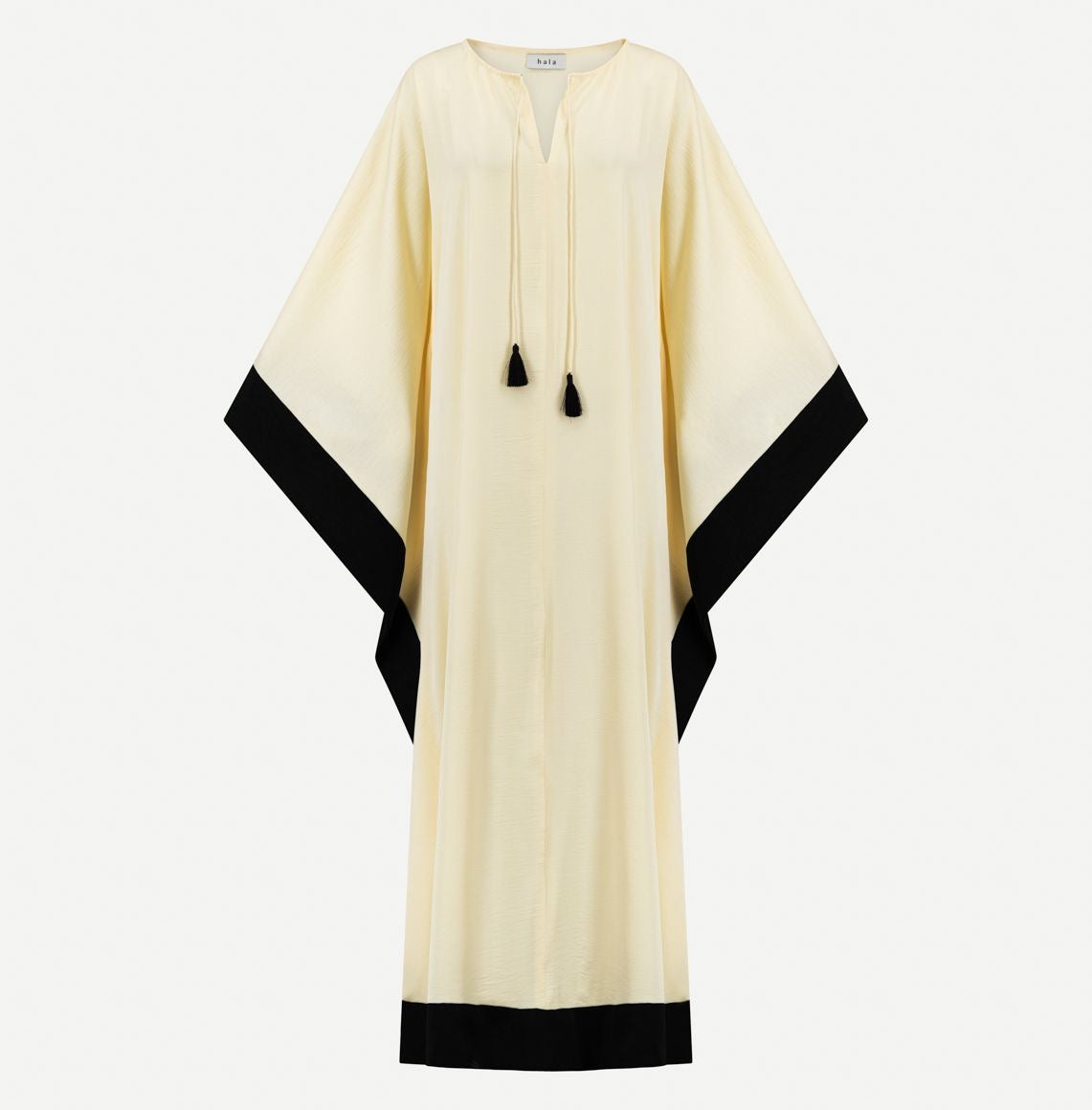 A modern take on traditional elegance, this kaftan style dress is crafted from high quality, textured satin that drapes beautifully, offering both comfort and a refined look. The wide cape like sleeves add an effortless charm, while the delicate tassel tie neckline brings a playful yet polished touch. Available in two timeless color combinations: soft cream with black accents and deep black with cream details, This dress is perfect for day-to-night dressing, whether for casual gatherings or formal occasions.