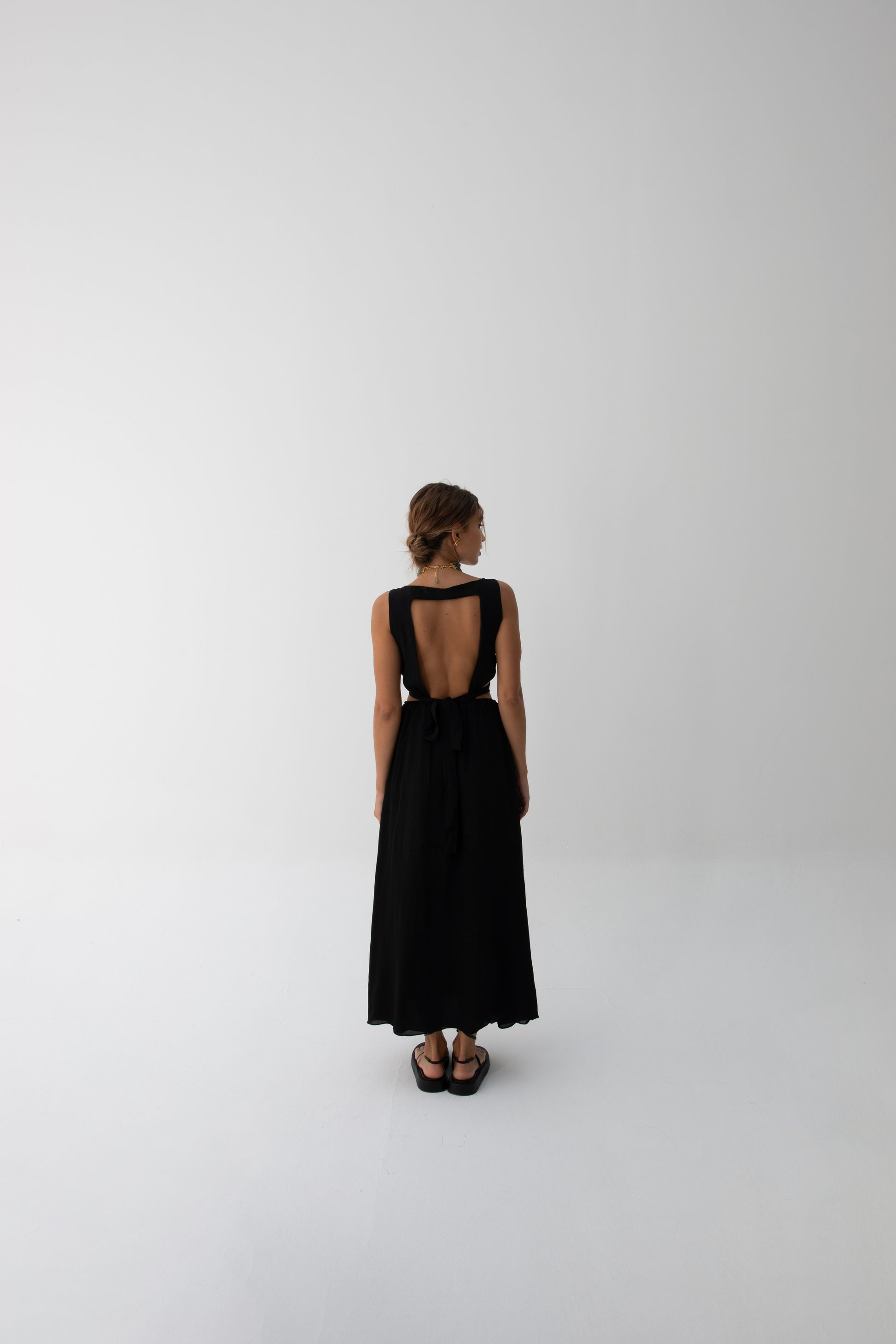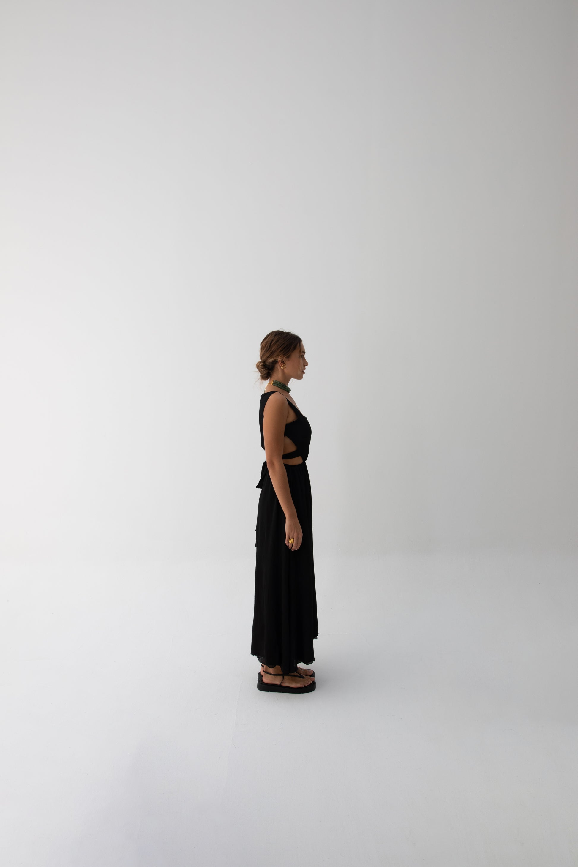 This floor-length dress is unique with its various cut-outs keeping it fun and playful but tasteful. The dress is fully lined and has an elastic waistband for comfort and ease. The finishing of the dress is French seams.