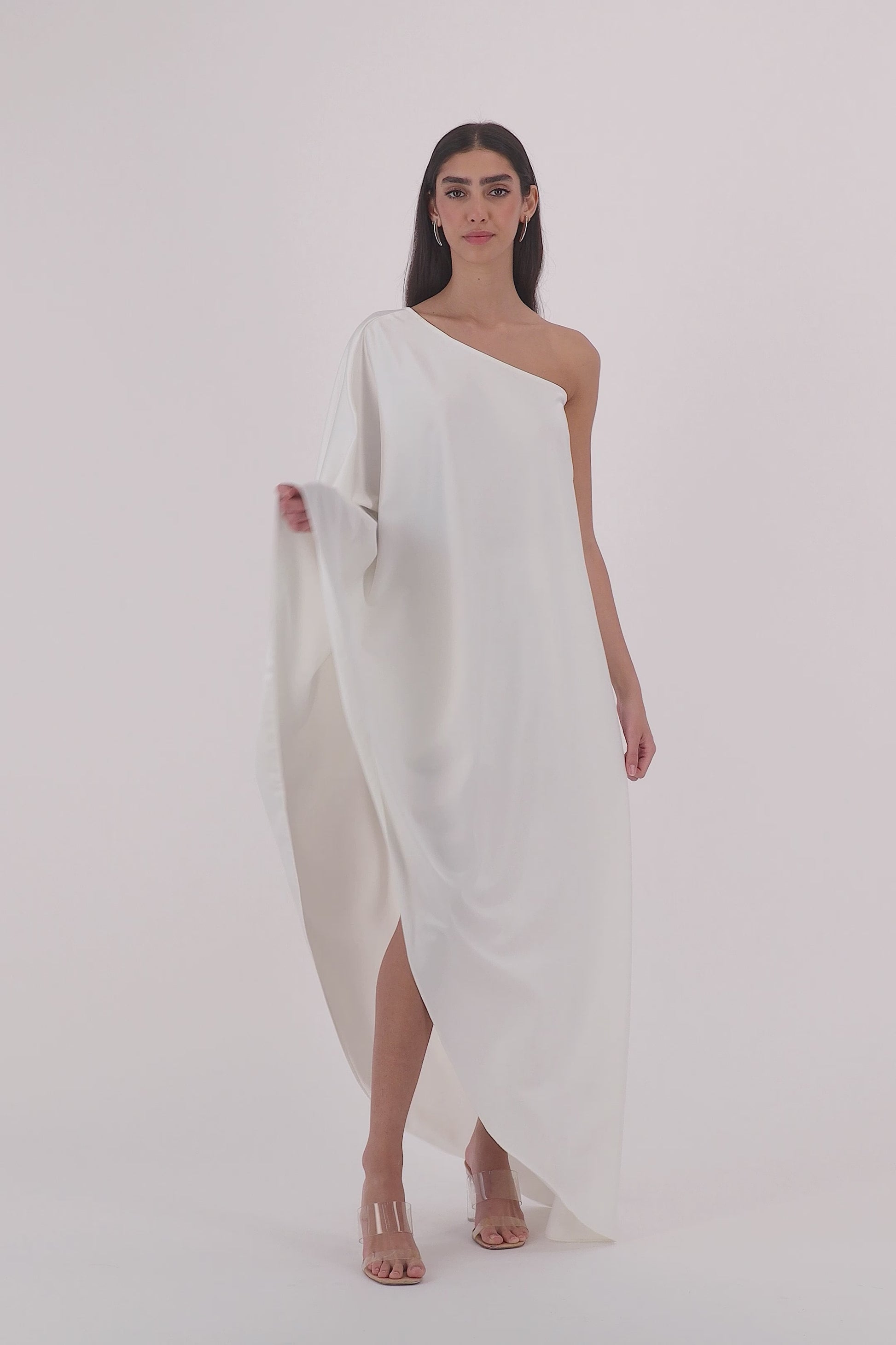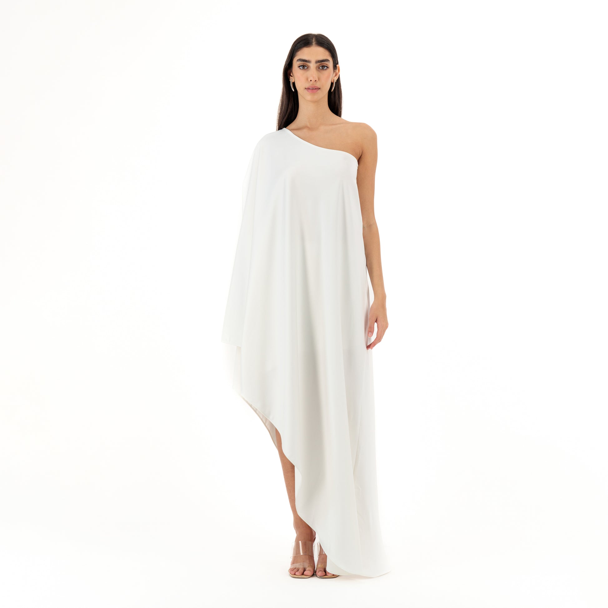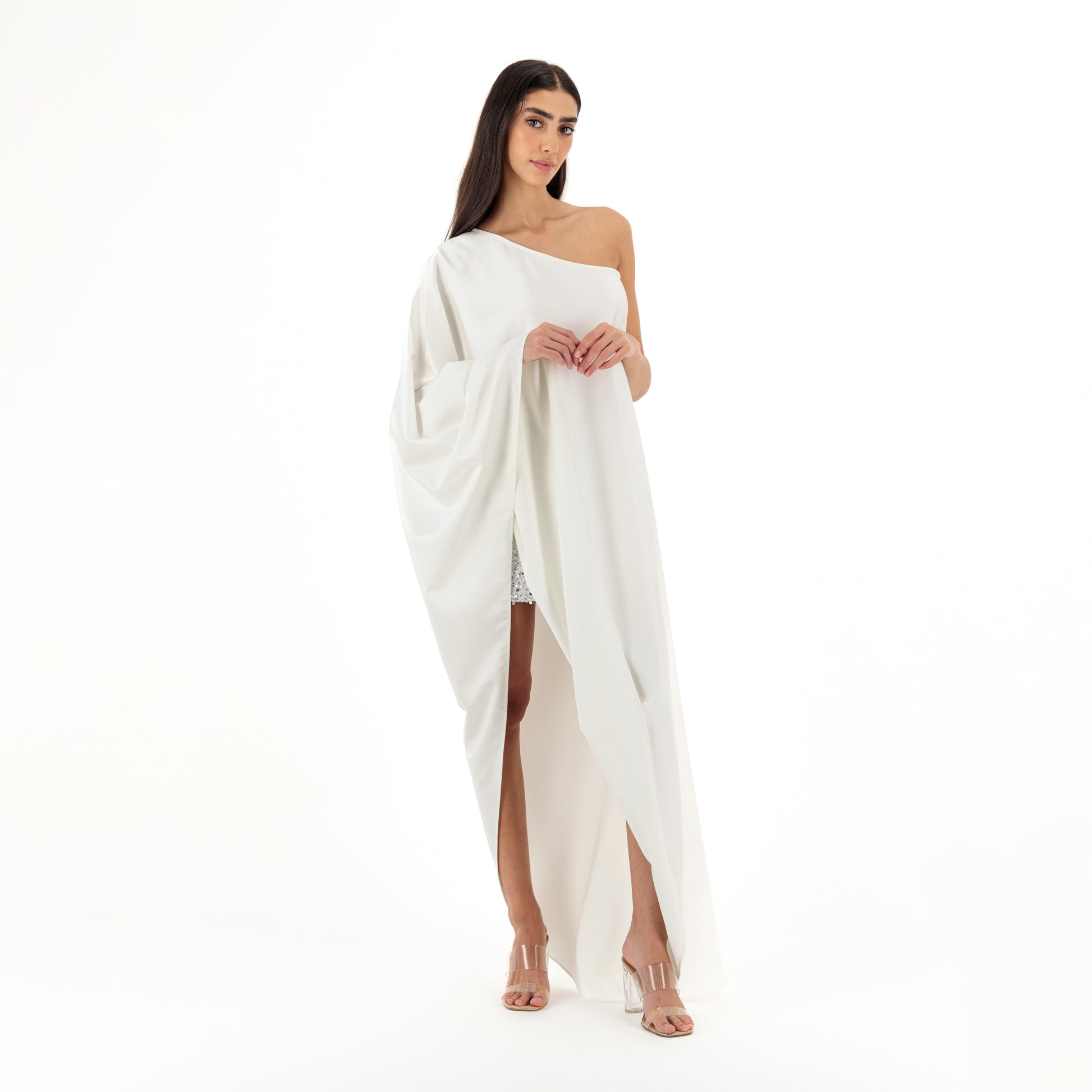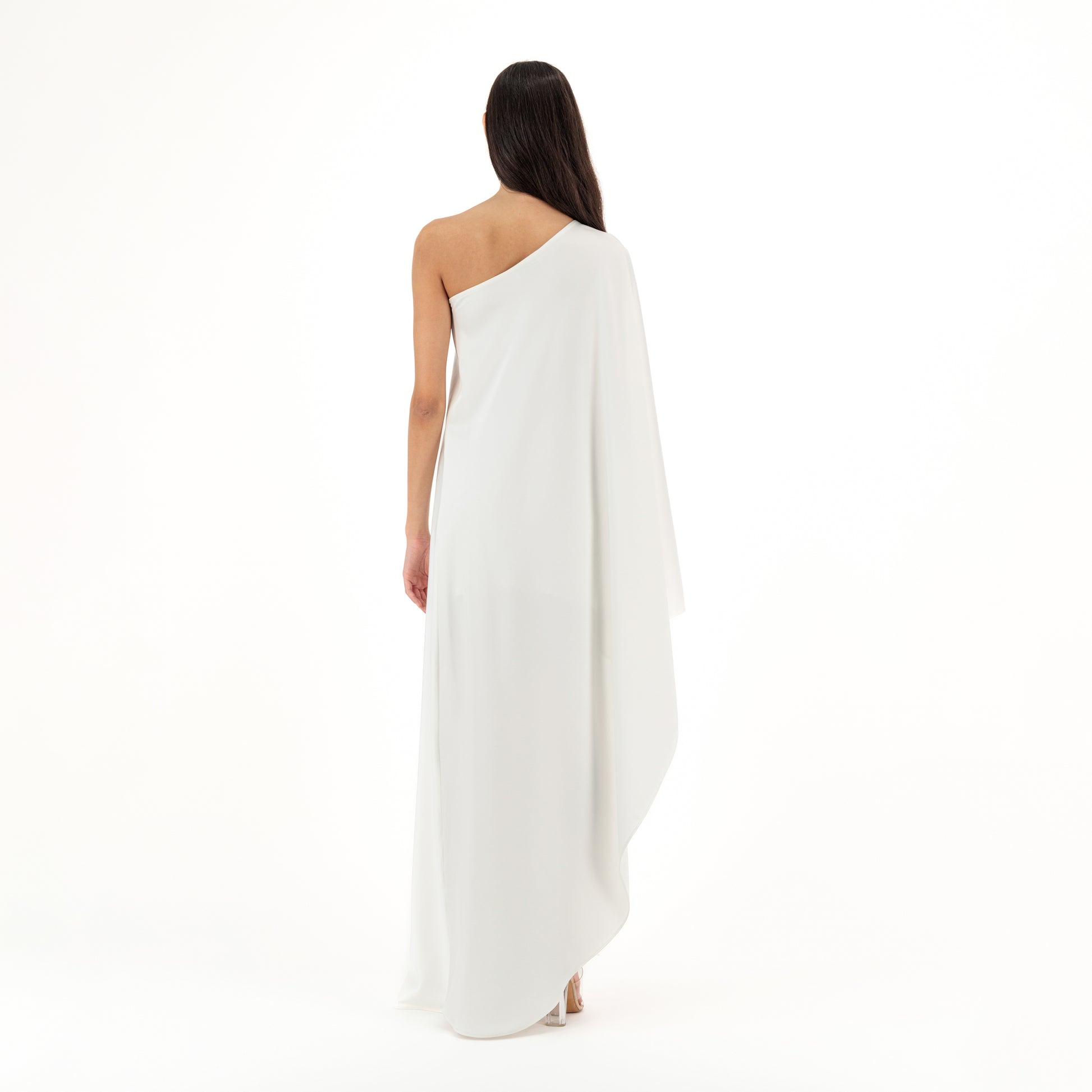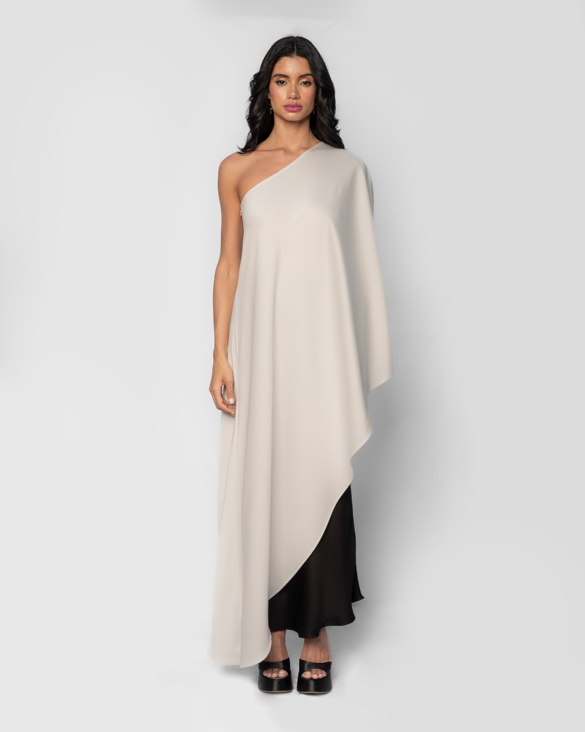 An asymmetrical off-shoulder top that cascades down from the sleeve, featuring a sleeveless side with a zipper for ease of wear. The garment gracefully extends to floor length on the right side.