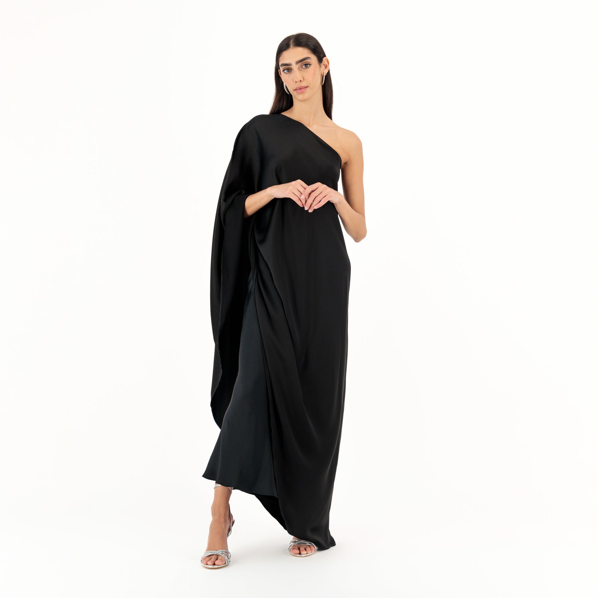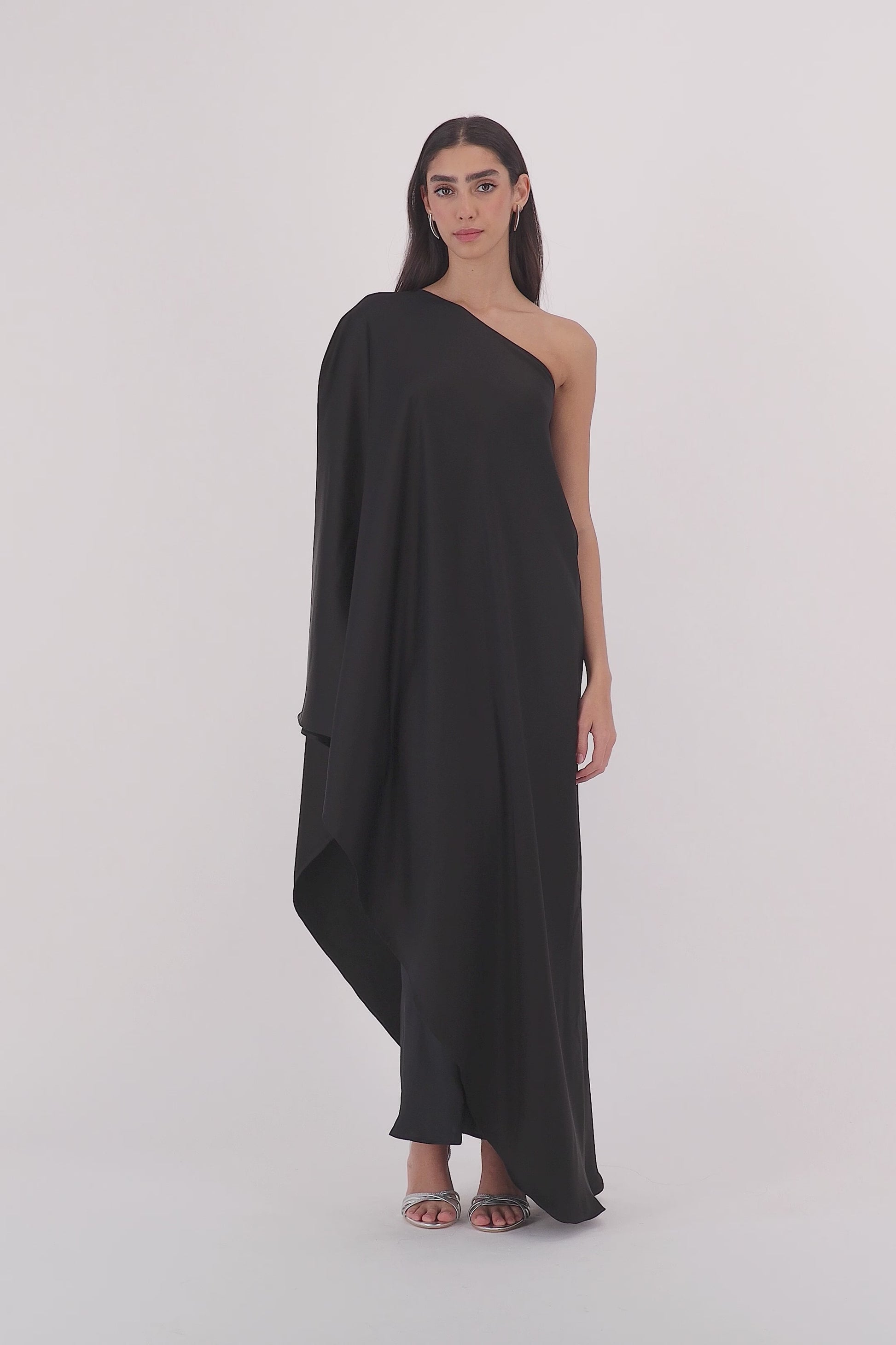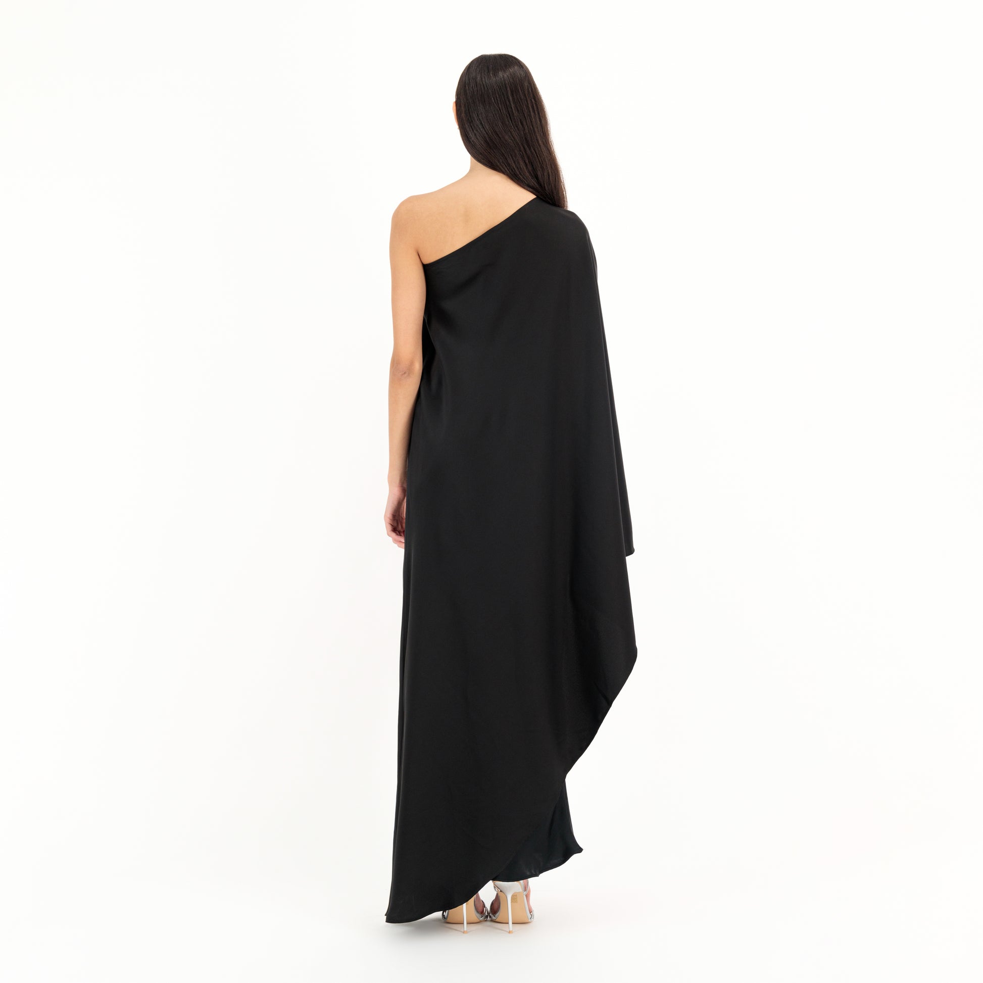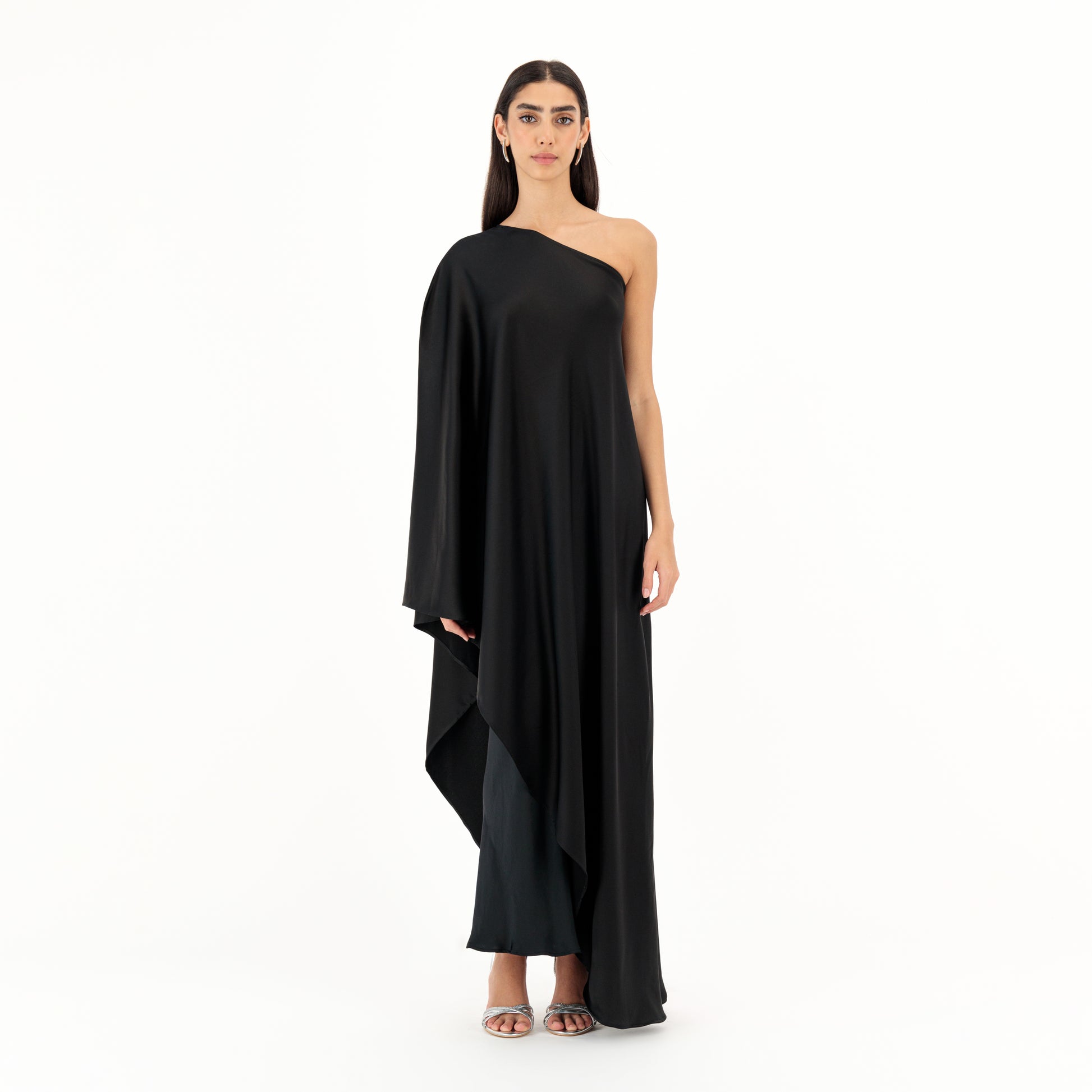 An asymmetrical off-shoulder top that cascades down from the sleeve, featuring a sleeveless side with a zipper for ease of wear. The garment gracefully extends to floor length on the right side.
