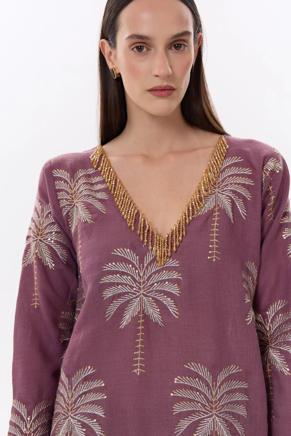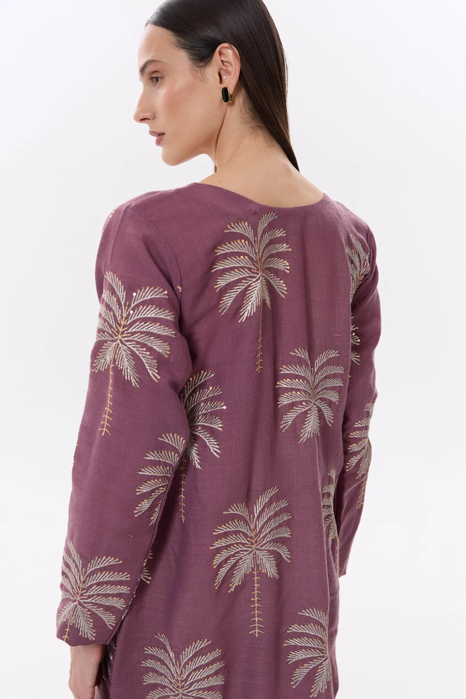 All-over embroidered palm motifs bring texture and depth to the design, creating a gentle rhythm across the fabric while maintaining a calm, grounded feel. Finished with long sleeves and clean side slits for movement, this piece balances artisanal detail with everyday wearability.