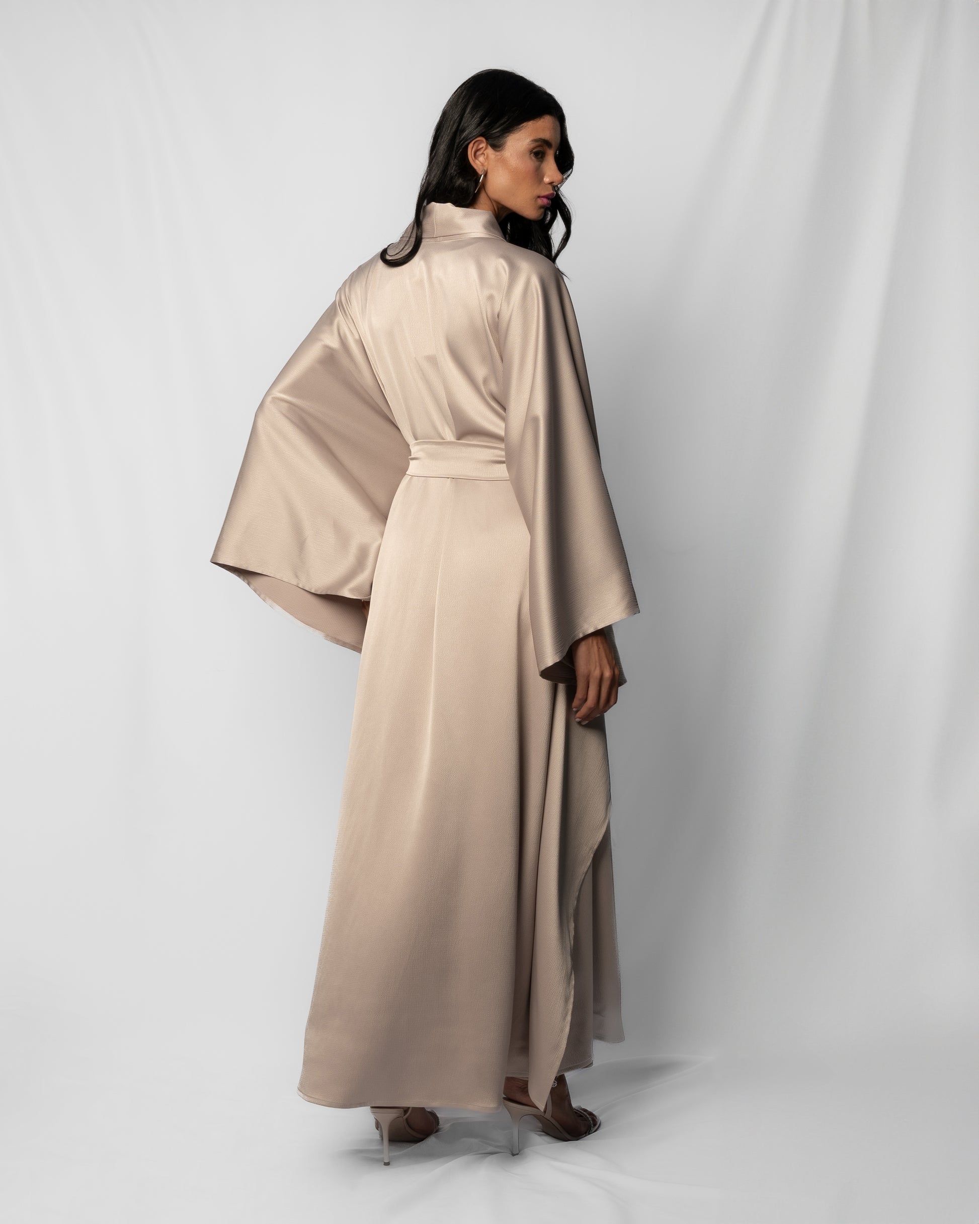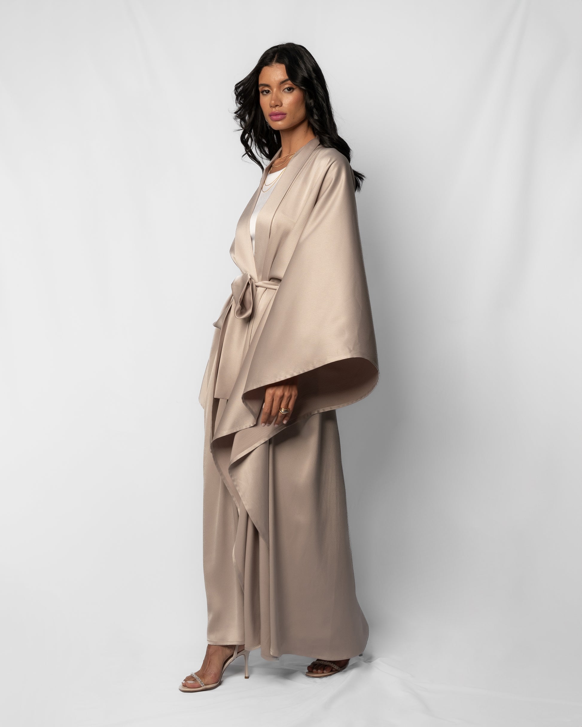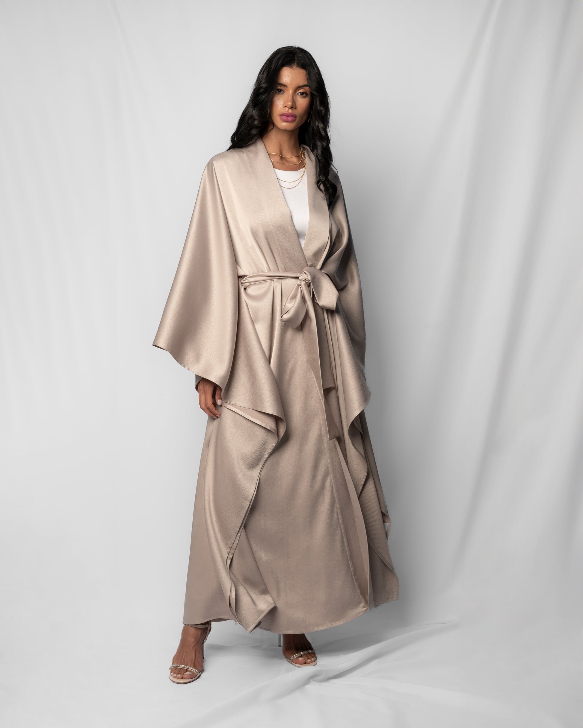 An abaya with a waist-accentuating belt. The side seams are open, allowing what you wear underneath to be visible.