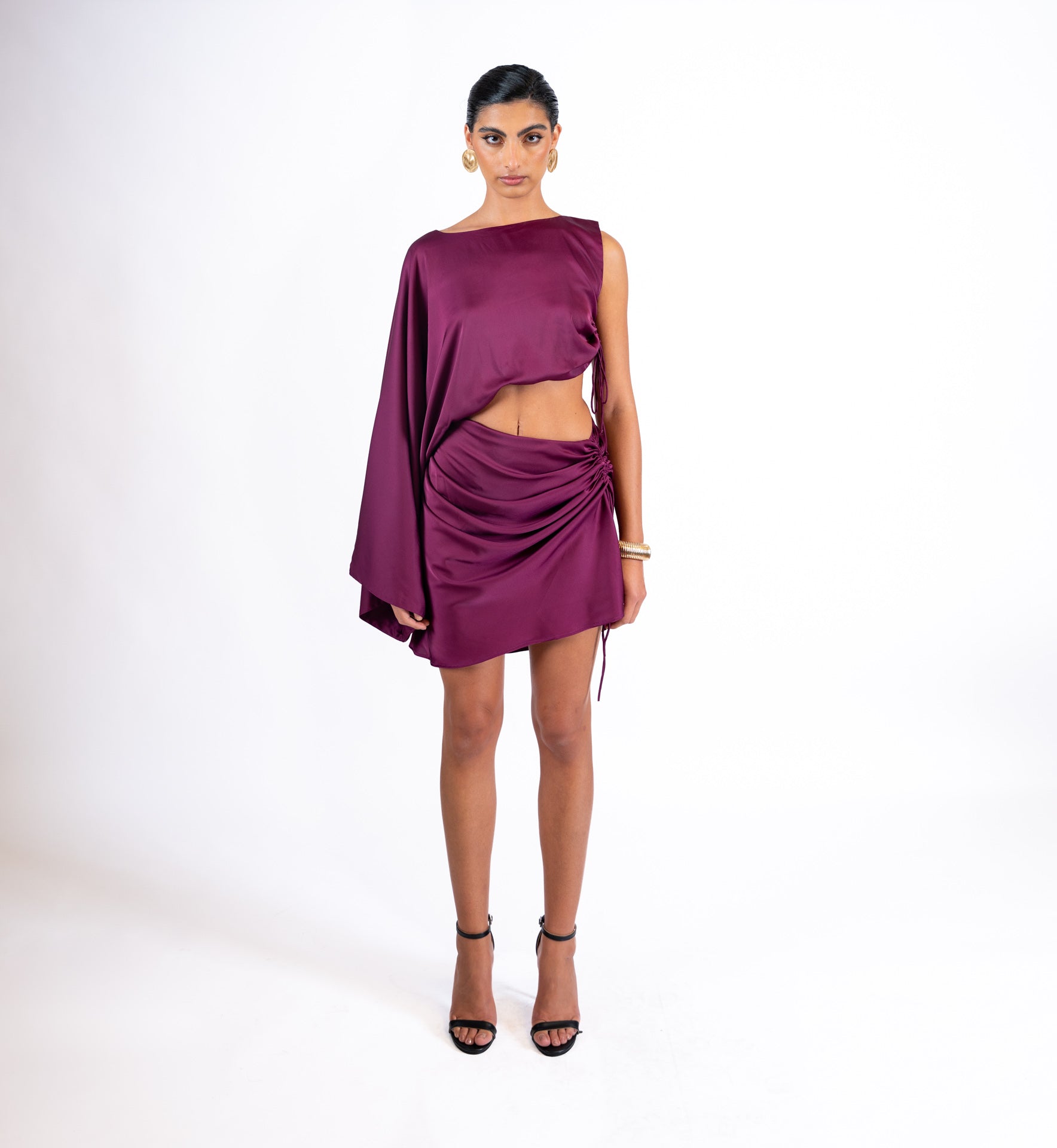 The Rae Satin Set is a modern, flowy satin two-piece designed for effortless style and versatility. The asymmetric top features soft ruching tied at the side, adding subtle texture and shape, while the coordinating skirt mirrors the ruching detail for a flattering, adjustable fit. This set is perfect for evenings that call for understated elegance with a hint of edge. Pair it with strappy heels and statement jewelry to complete the look.