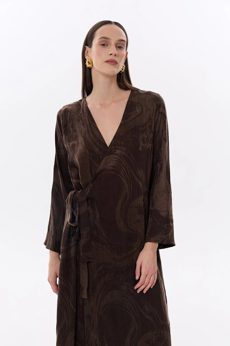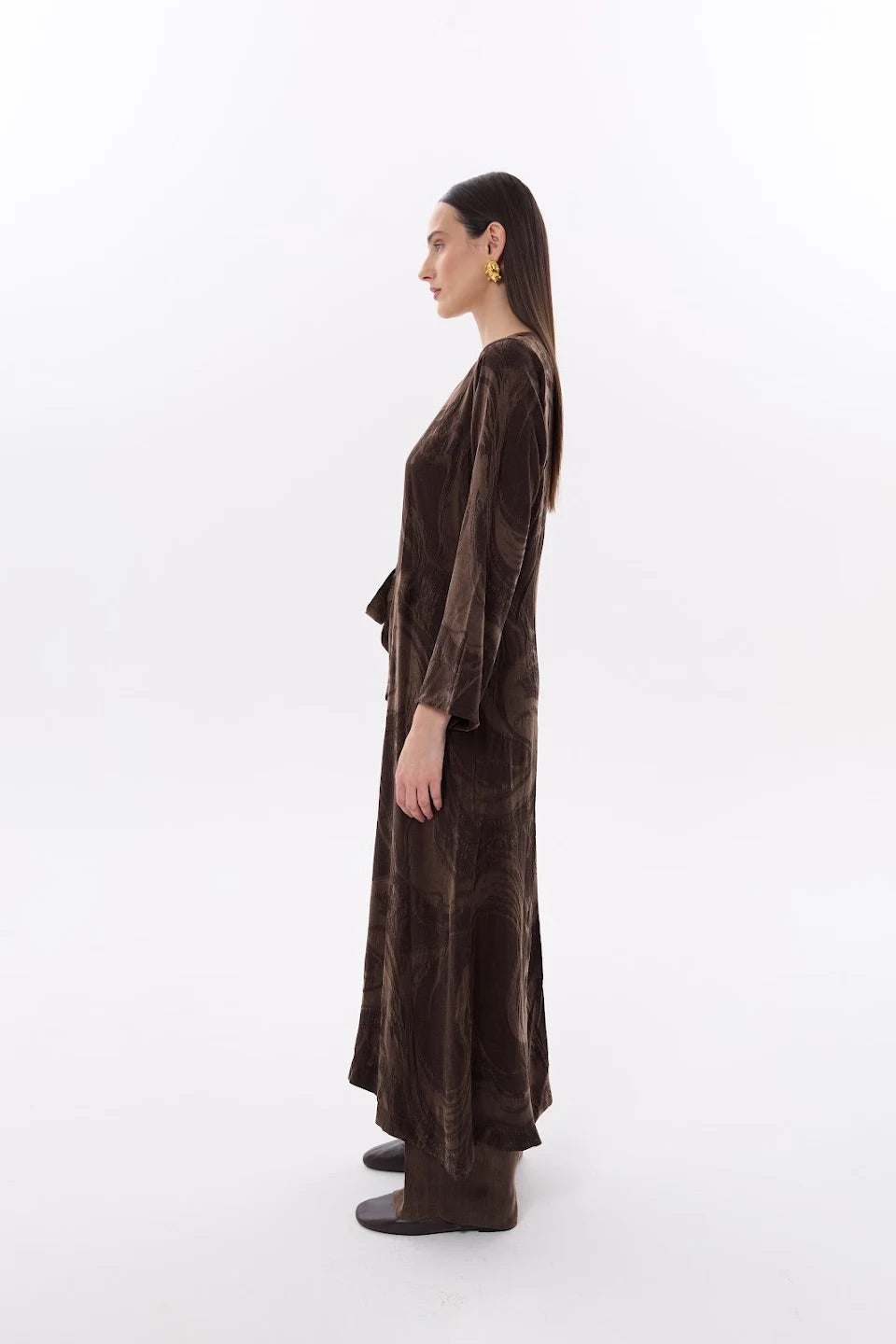 The softly flared sleeves enhance the drape, complementing the lightweight cupro jacquard fabric that features a tonal, organic pattern throughout. Finished with clean hems and minimal stitching, this piece transitions seamlessly from day to evening.