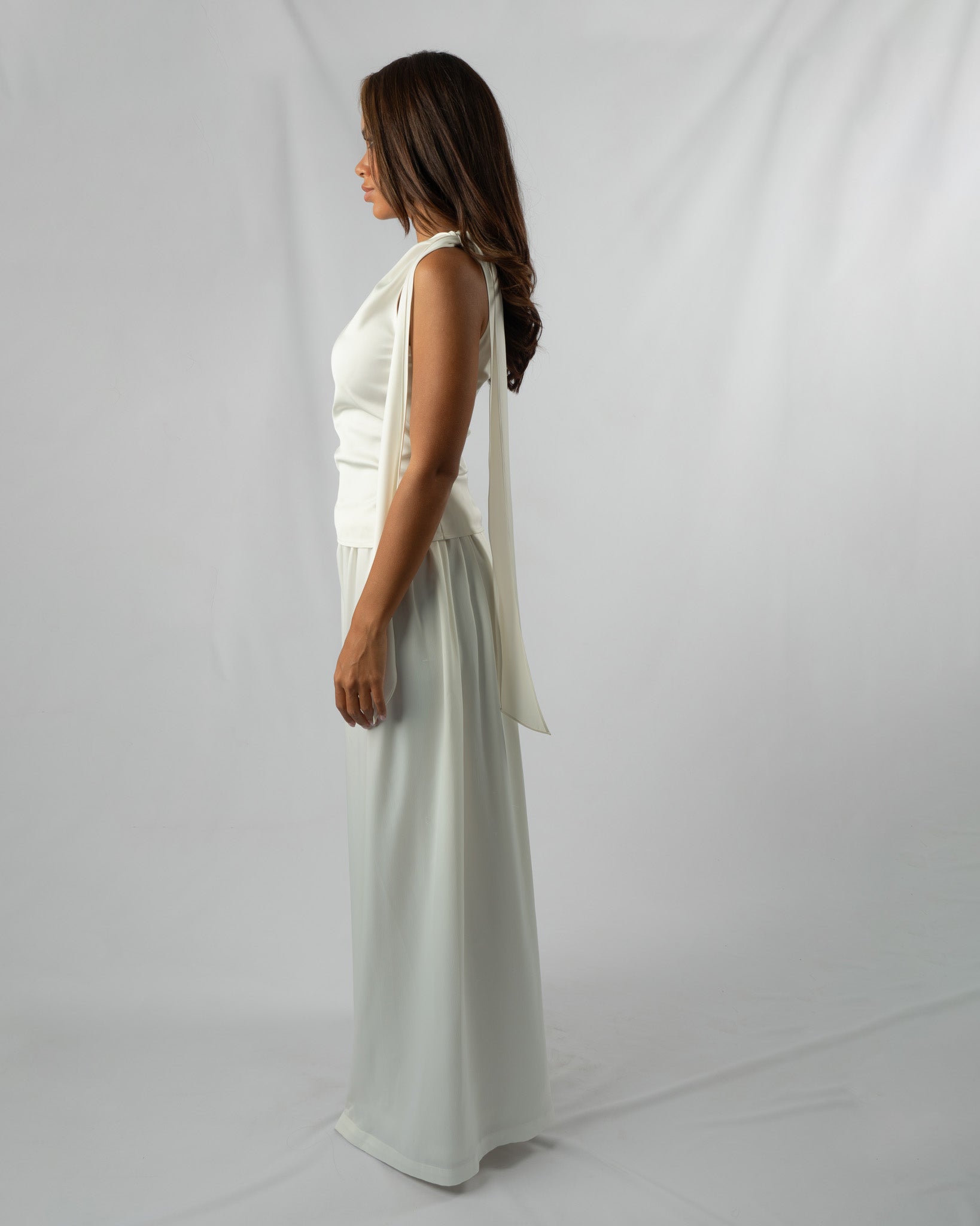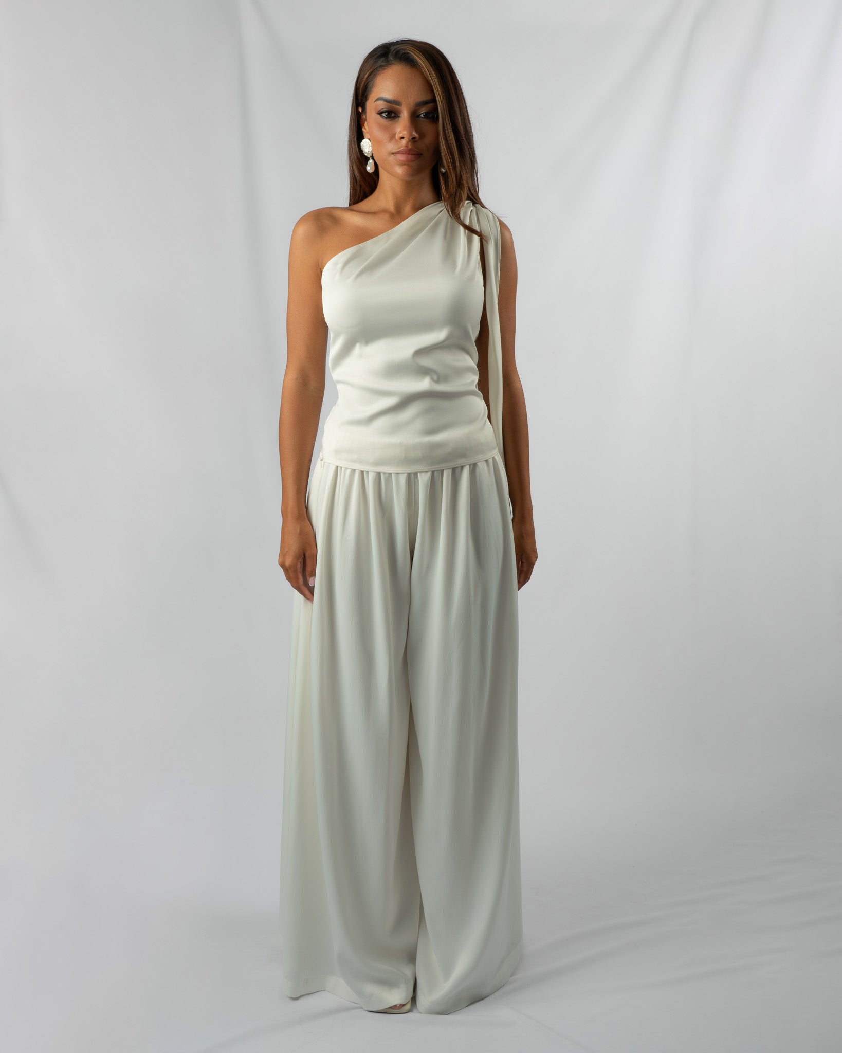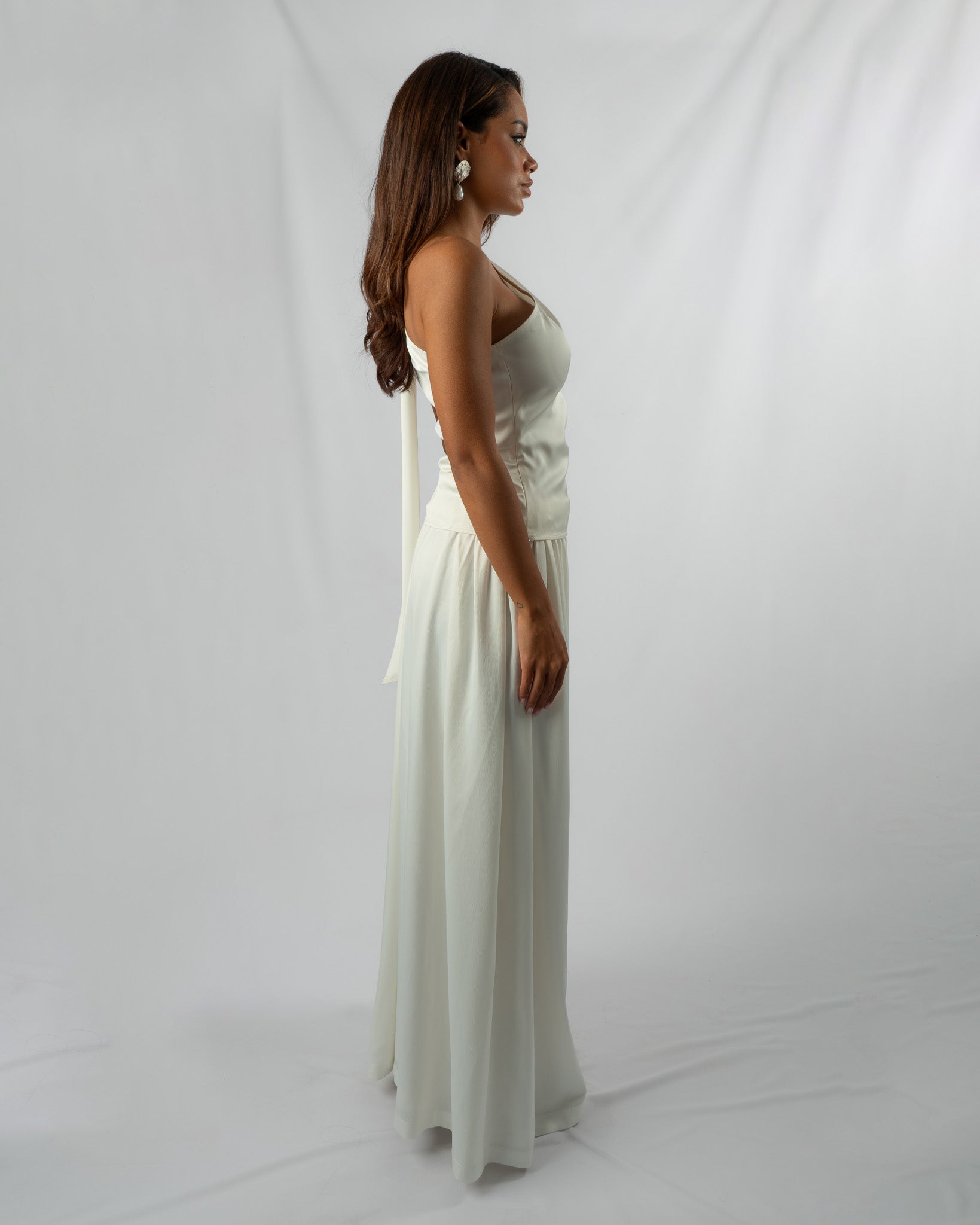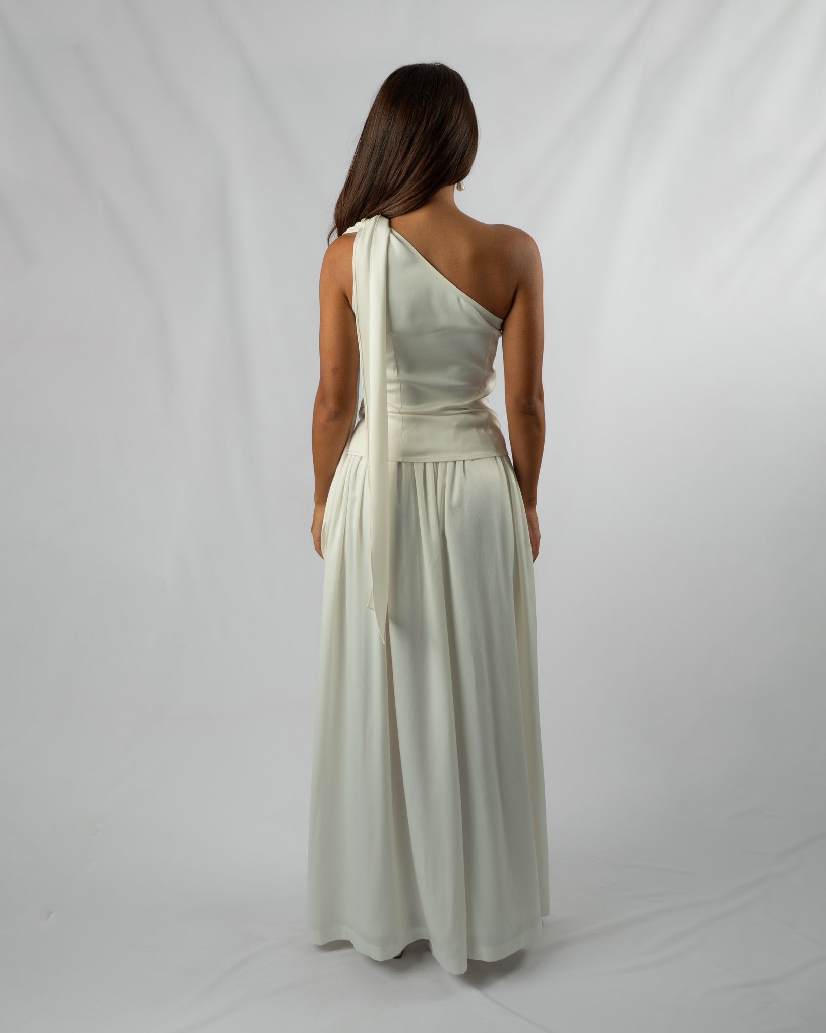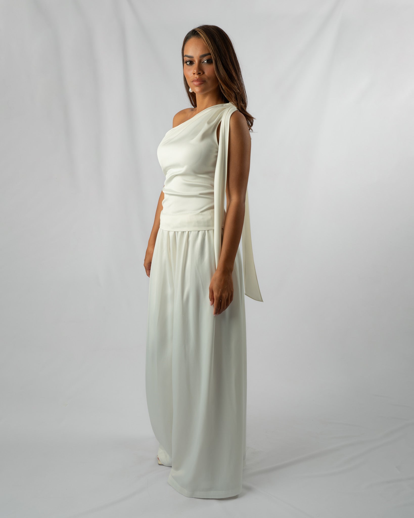 The Ribbon top is an ideal choice for any occasion. Crafted from beautiful silky white material, it can instantly elevate your look, ensuring you stand out. The asymmetrical design boasts a captivating feature on the shoulder, creating the illusion of a tied knot. Additionally, the top is equipped with a side zipper for easy wear.
