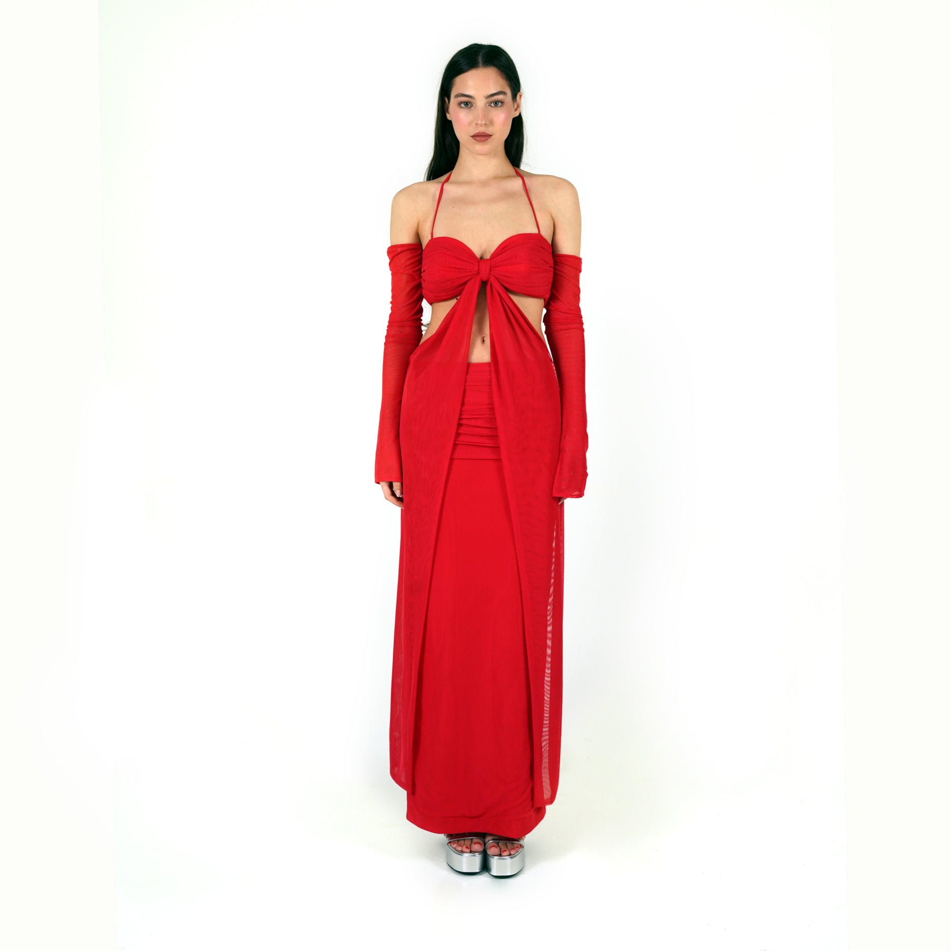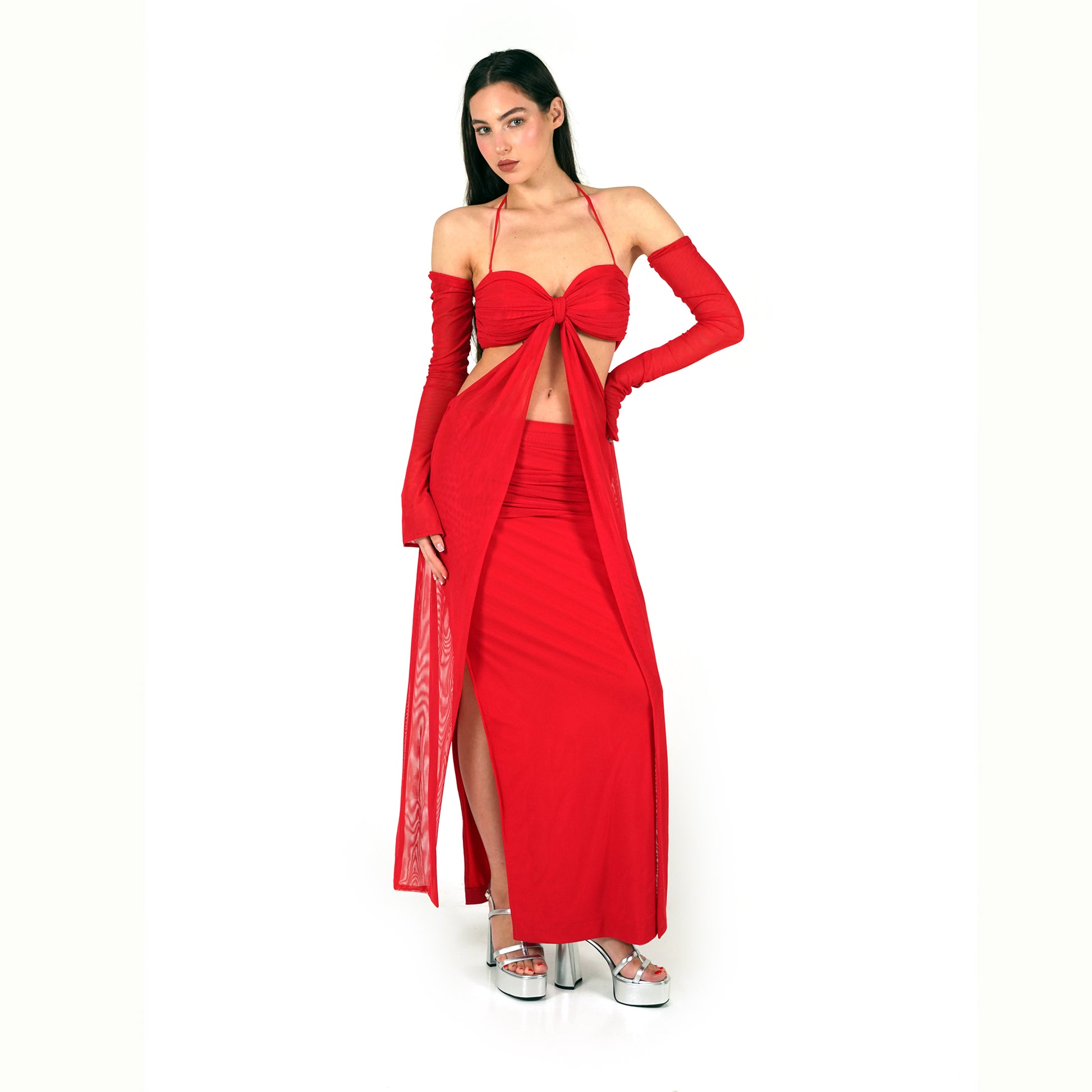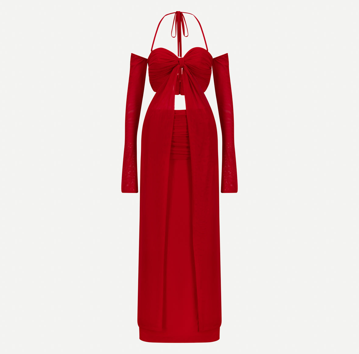 Make a statement in our bold red two-piece 'Ruby Set'. The halter-style gathered top features an adjustable bow at the front, offering a customizable fit, while the open-back design features a zipper for easy wear. The non-attached sleeves provide versatility, allowing you to wear the outfit with or without them.