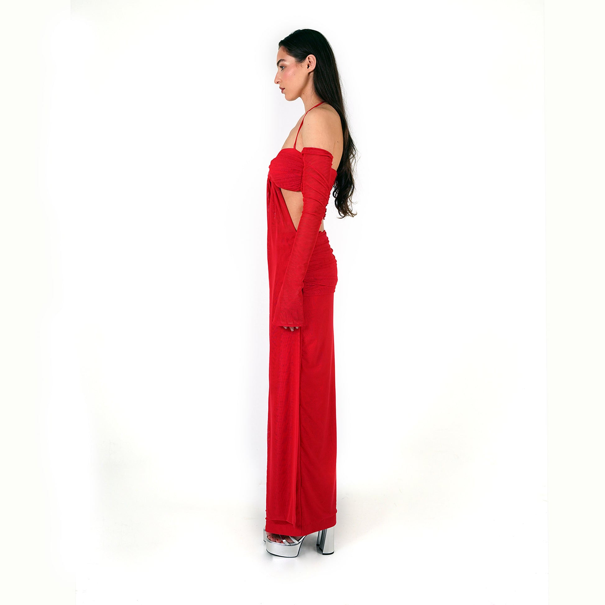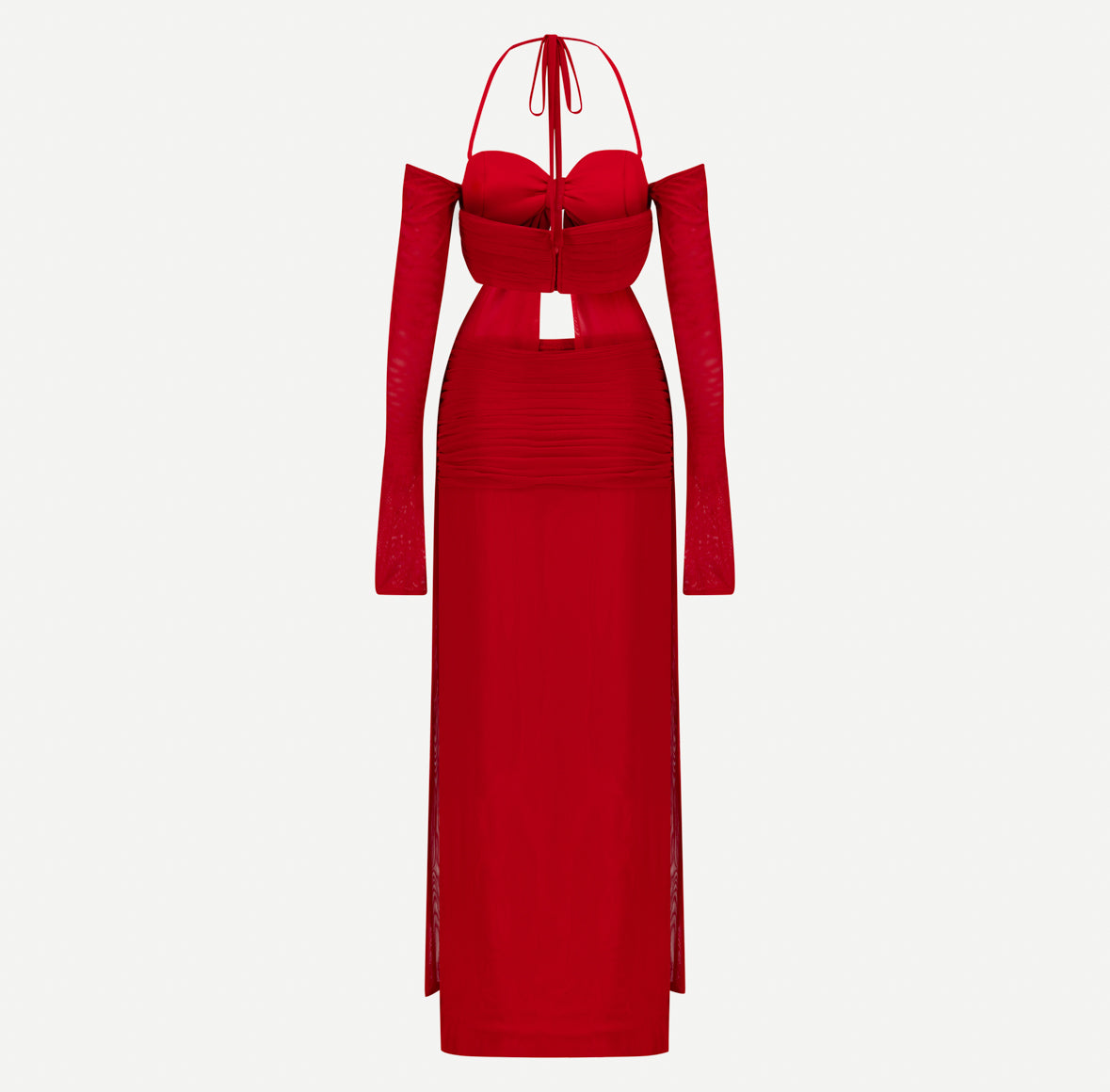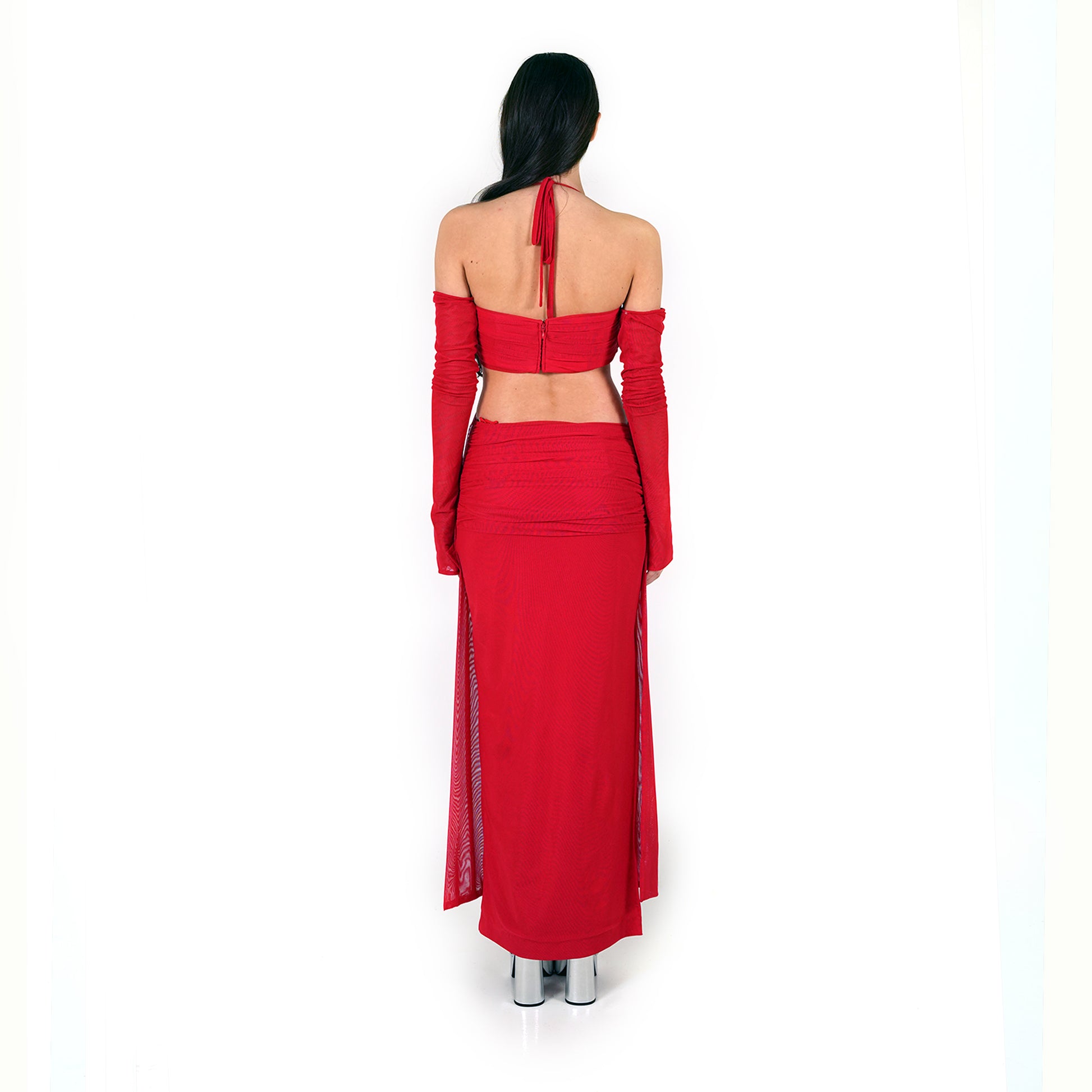 Make a statement in our bold red two-piece 'Ruby Set'. The halter-style gathered top features an adjustable bow at the front, offering a customizable fit, while the open-back design features a zipper for easy wear. The non-attached sleeves provide versatility, allowing you to wear the outfit with or without them.