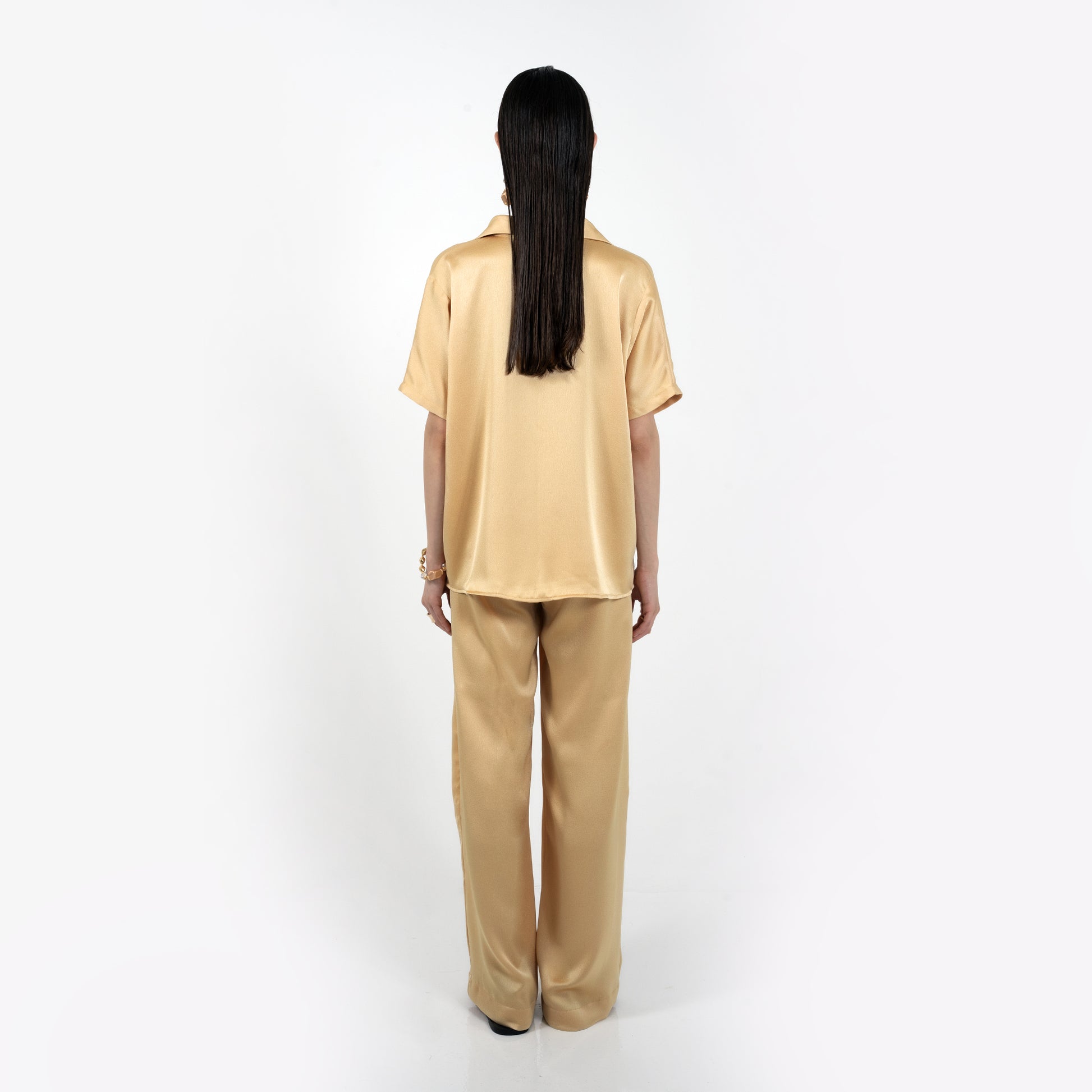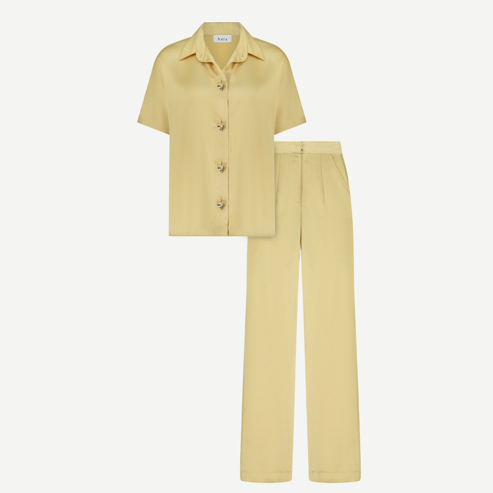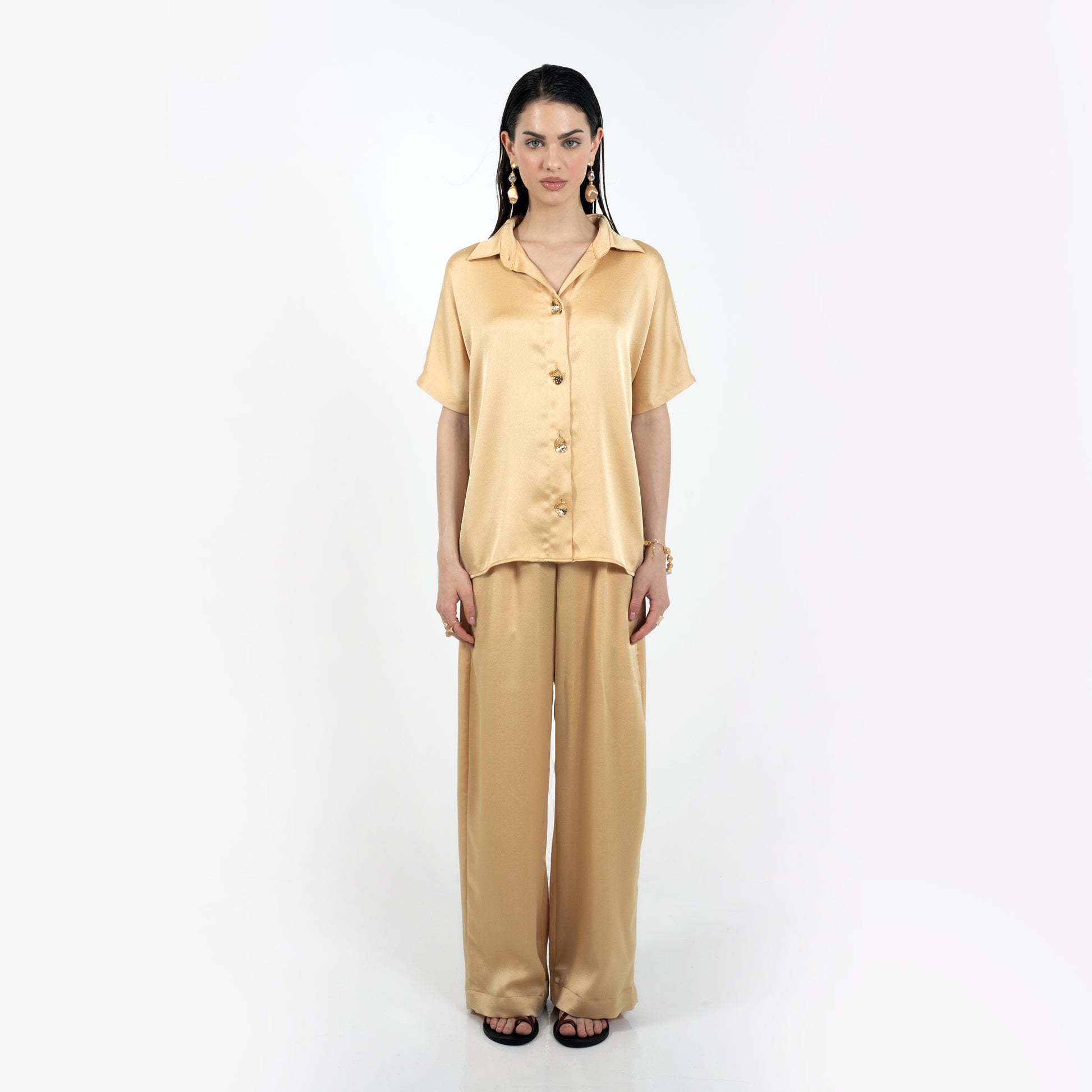 A timeless two-piece designed for everyday ease, the Seara Set in dusty yellow brings relaxed elegance to your summer wardrobe. Crafted in a soft, breathable satin, the set features a slightly oversized shirt with short sleeves, golden hardware buttons, and a length that falls just below the hips for extra comfort and coverage. The matching trousers have a tailored front and an elasticated waistband at the back, offering both polish and all day wearability.