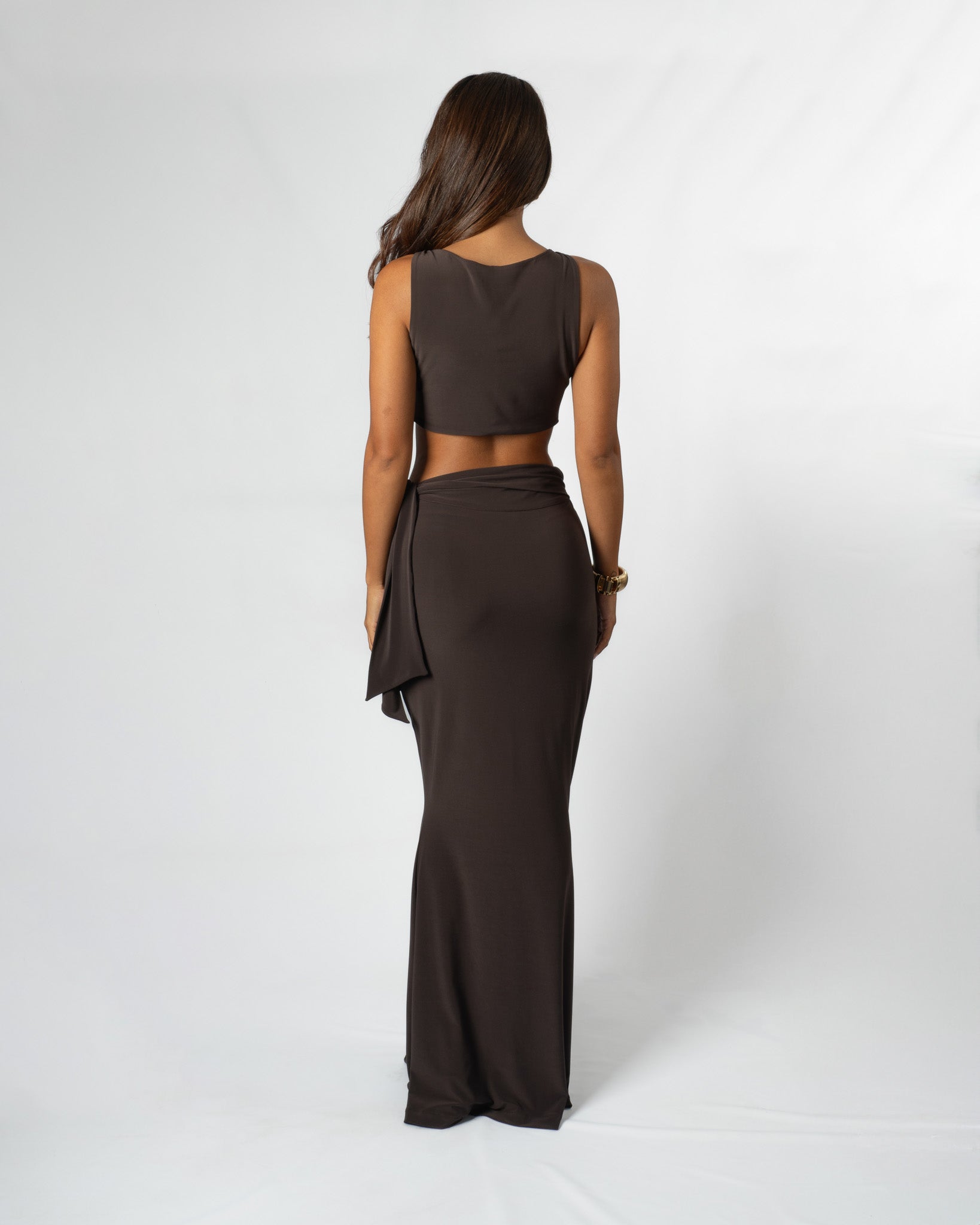 The Selma Set is crafted from the most buttery chocolate brown fabric. It features a side tie on the skirt to accentuate the waist and a small zipper for ease of wear. The skirt fits snugly until the knees, then becomes flowy and easy to walk in. The crop top boasts charming shoulder detailing, adding a touch of uniqueness to this set.