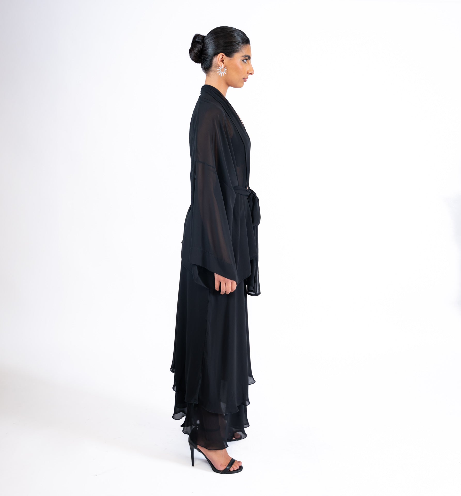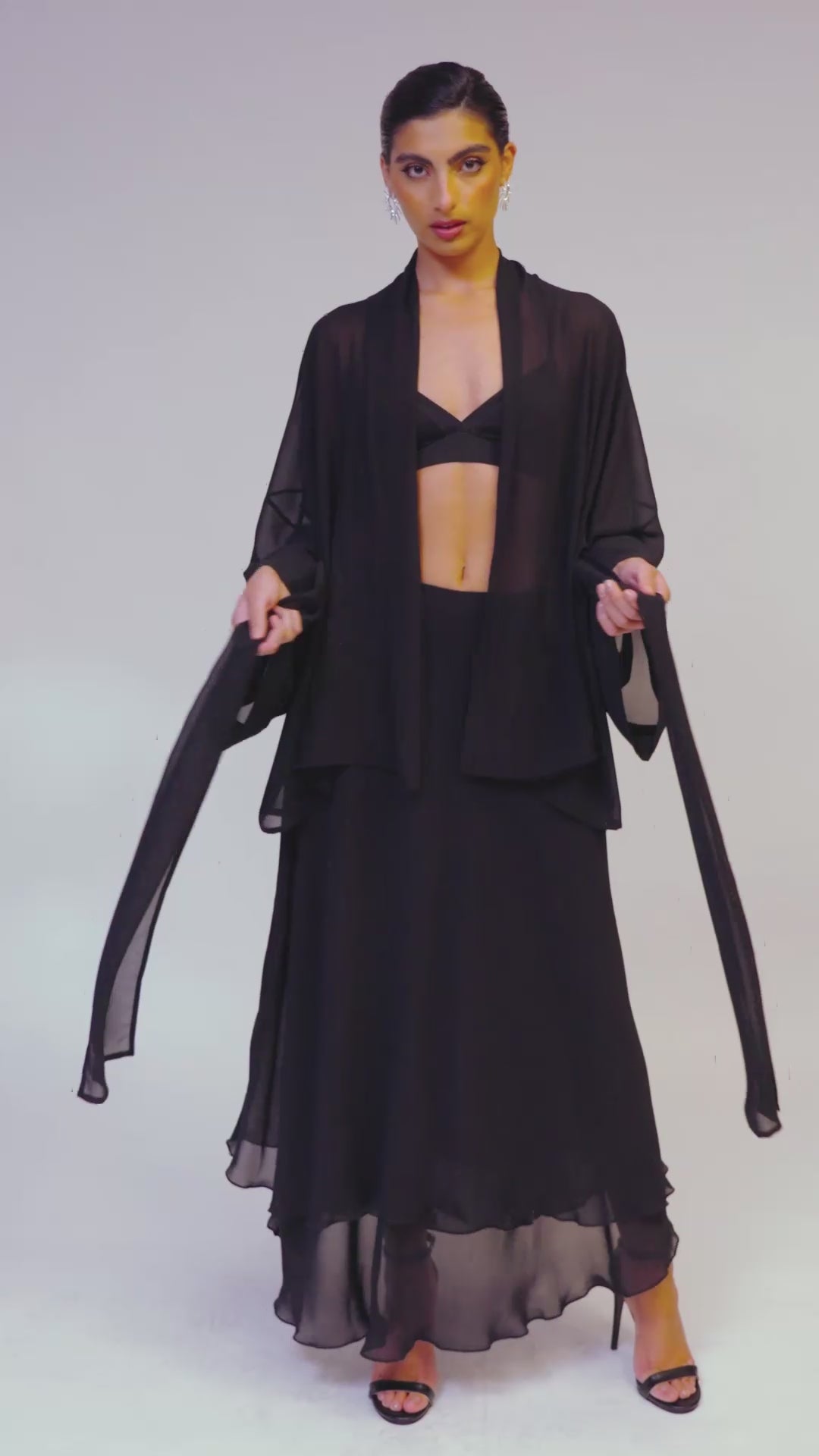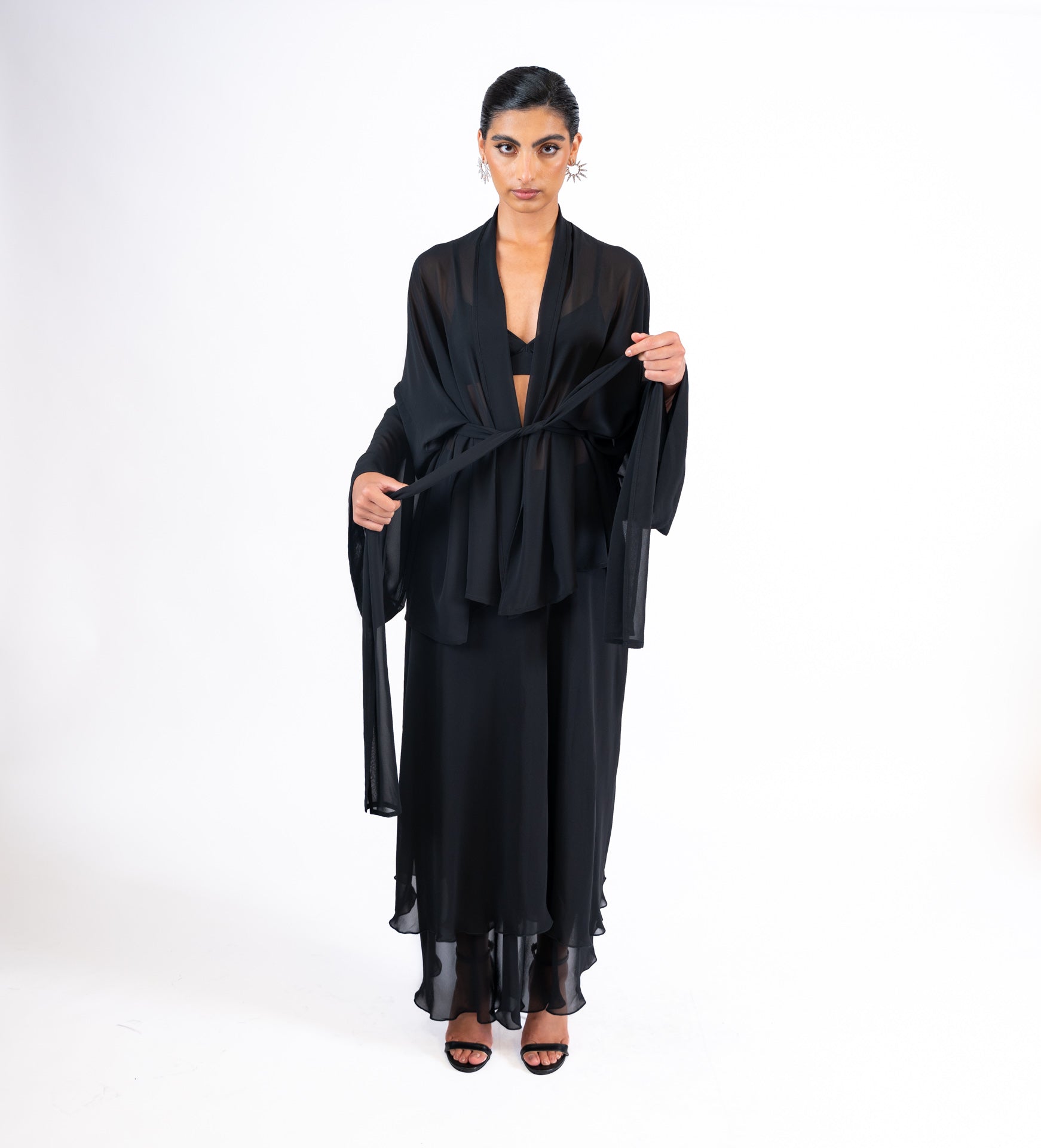 The chiffon jacket is a lightweight piece that effortlessly combines style and versatility. With its relaxed fit, flowing silhouette, and waist-cinching tie belt, this jacket can be styled open or closed for a soft, elegant finish. Perfect for layering over statement separates or worn on its own for understated sophistication.
