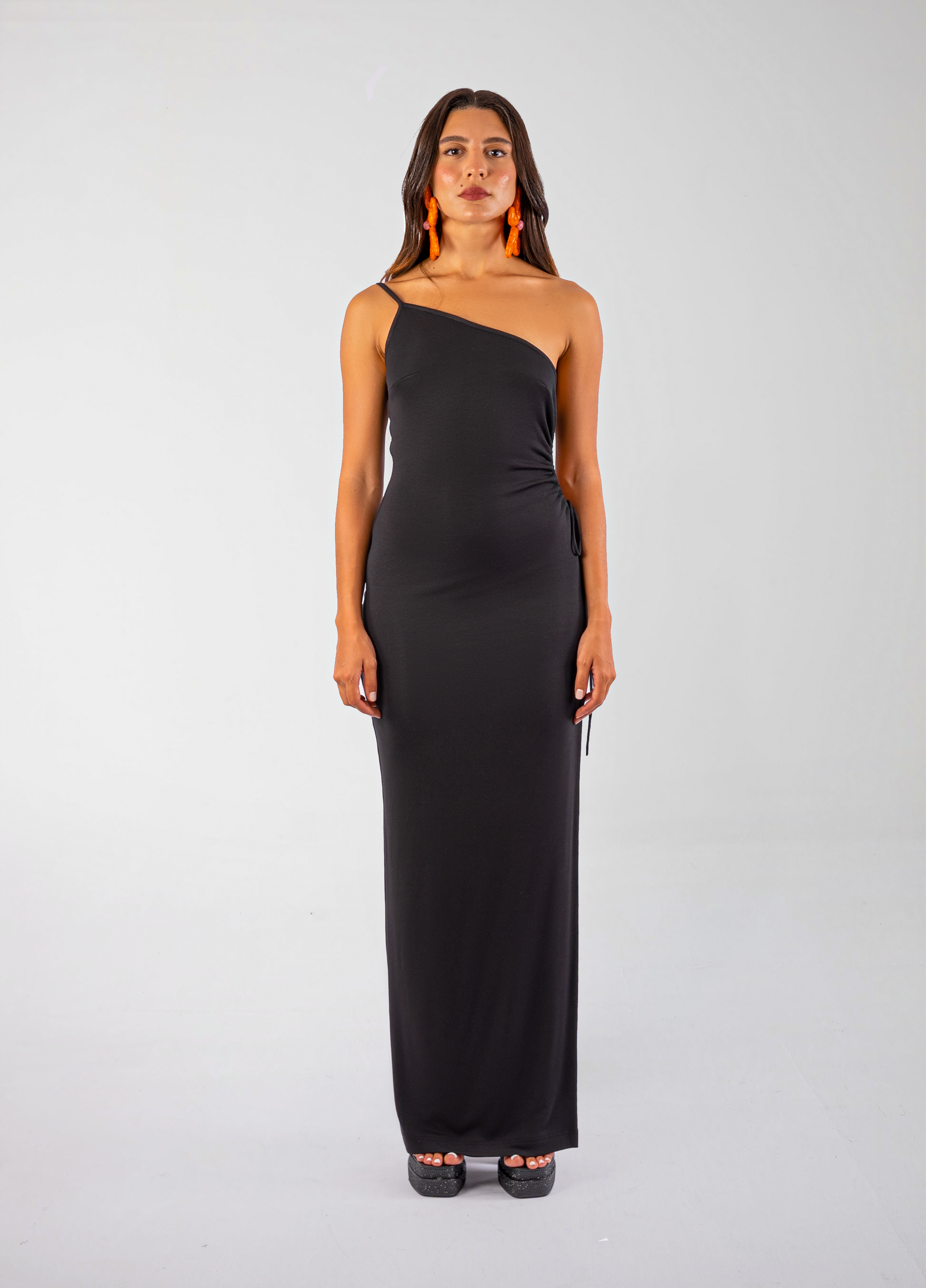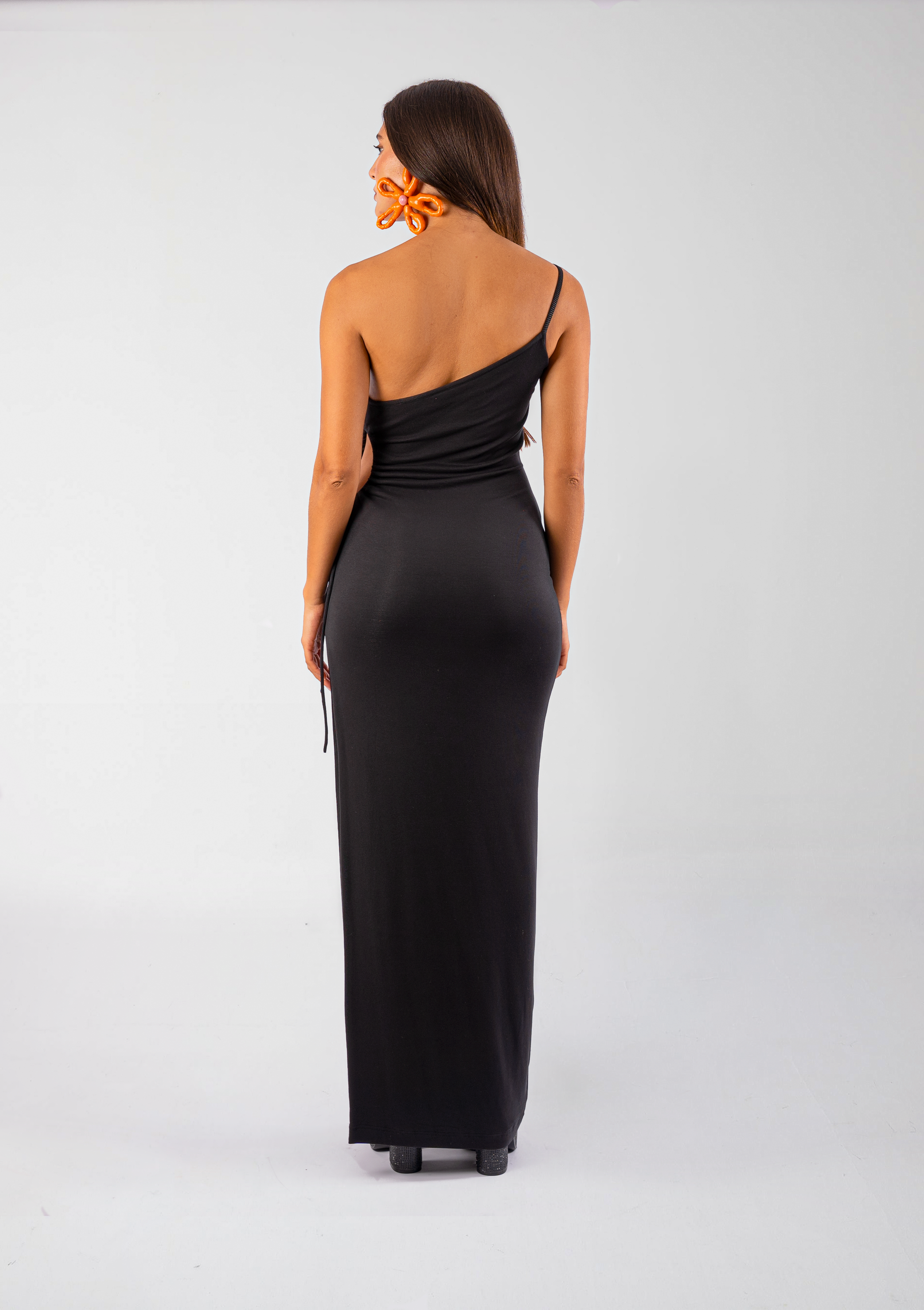 Asymmetrical one shoulder maxi dress with an exaggerated slit on the side seam and a round circular shape that is tied according to how open you would like the opening to be by a drawstring