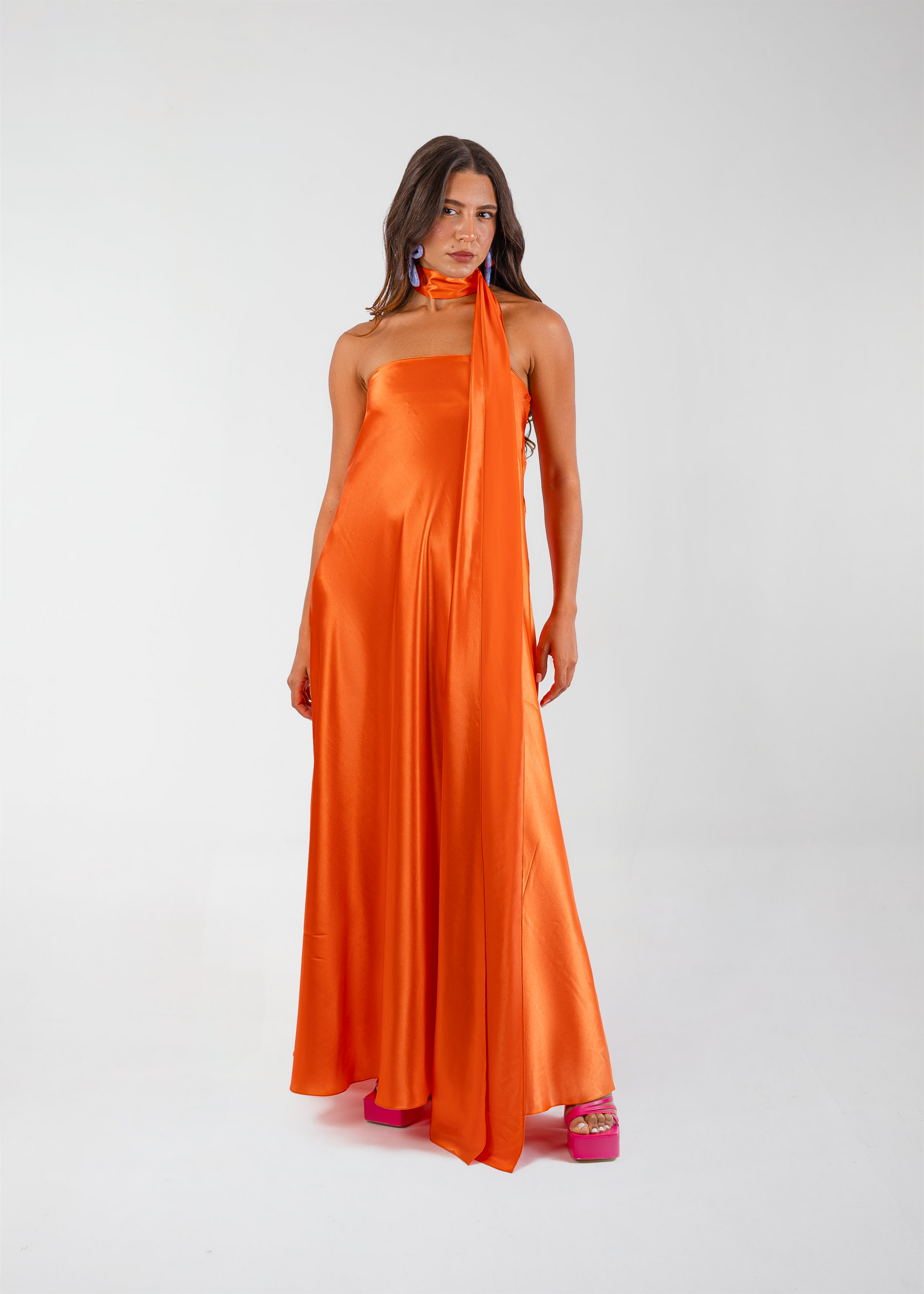 Gorgeous strapless floor length fiery orange dress in Satin.