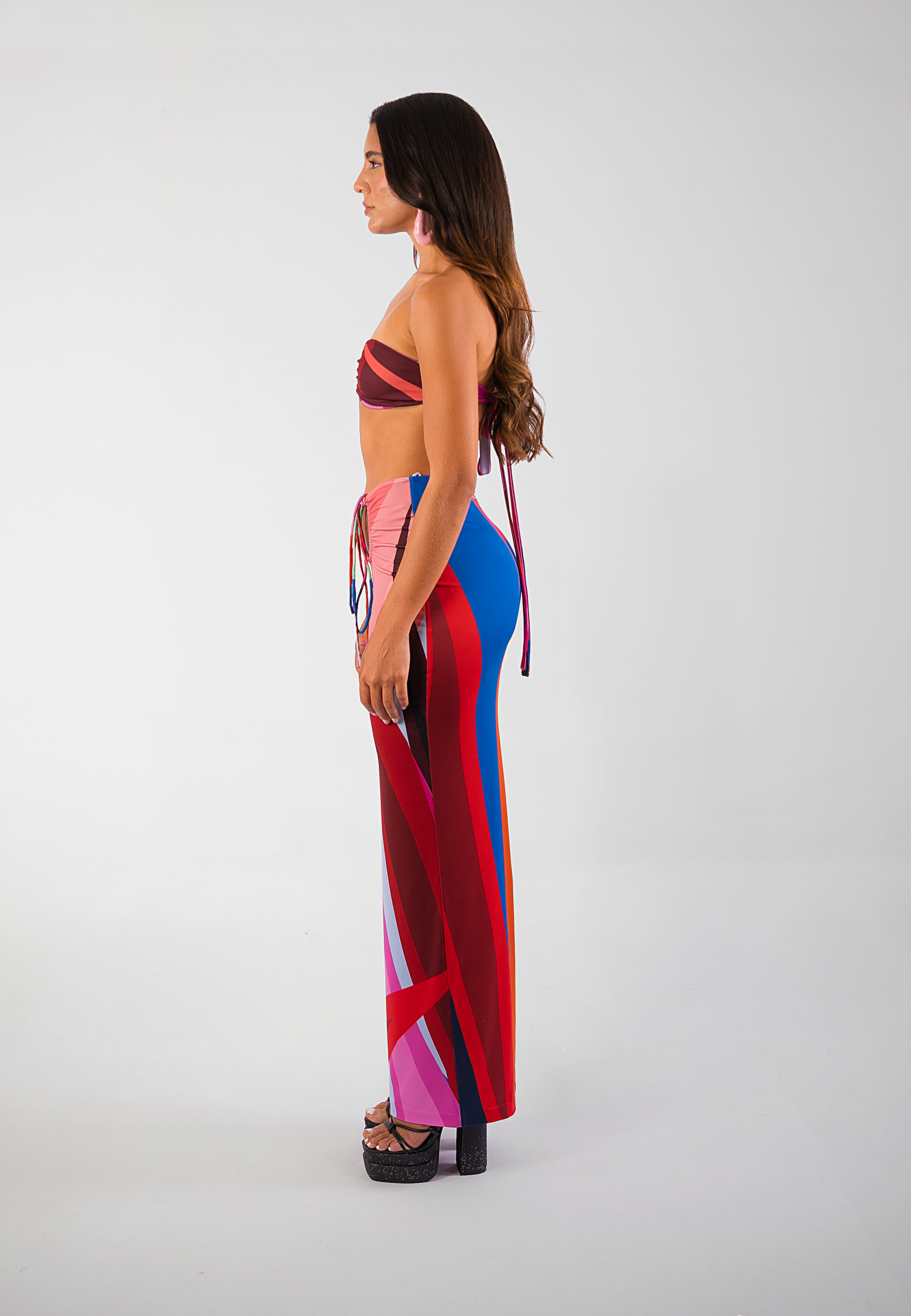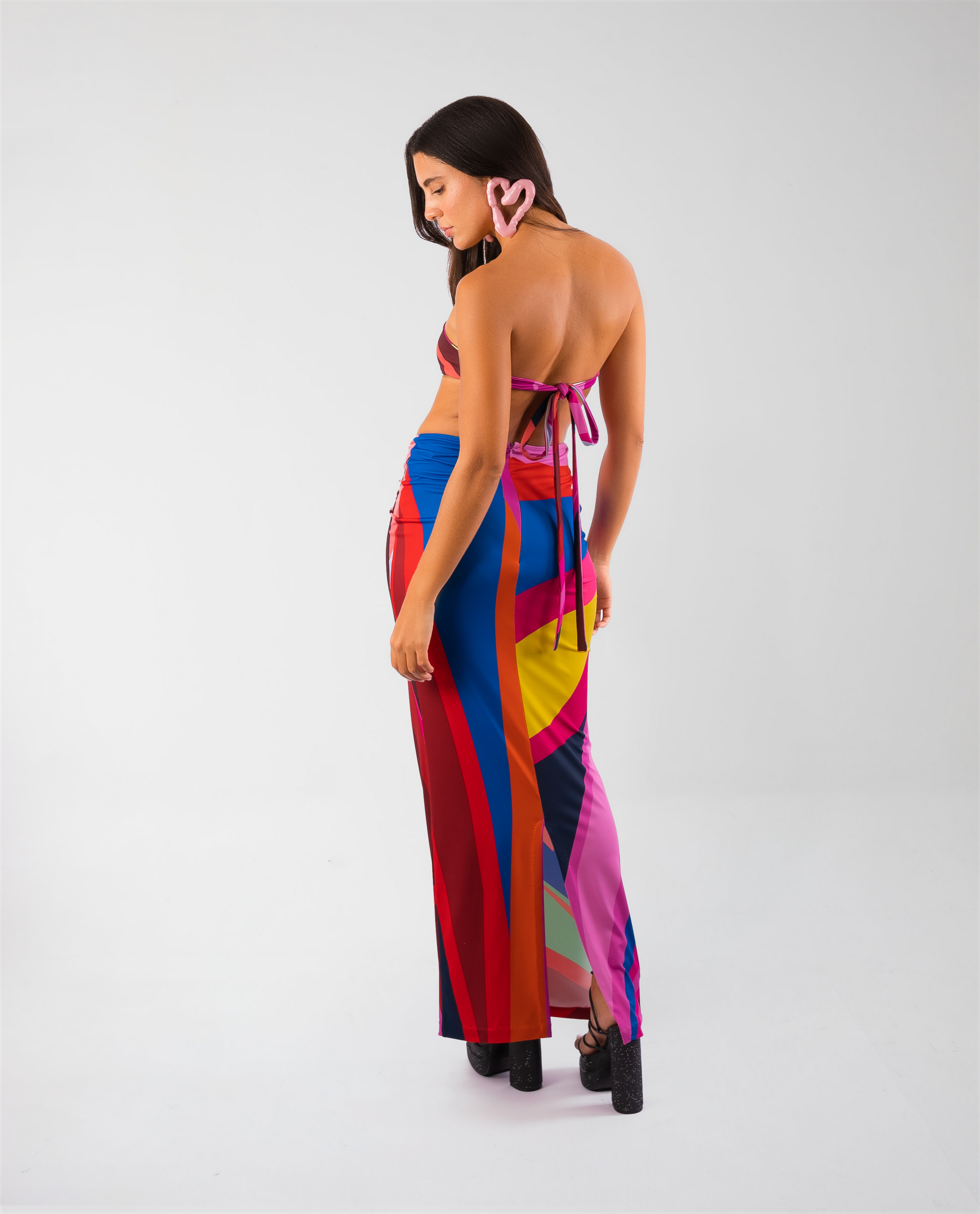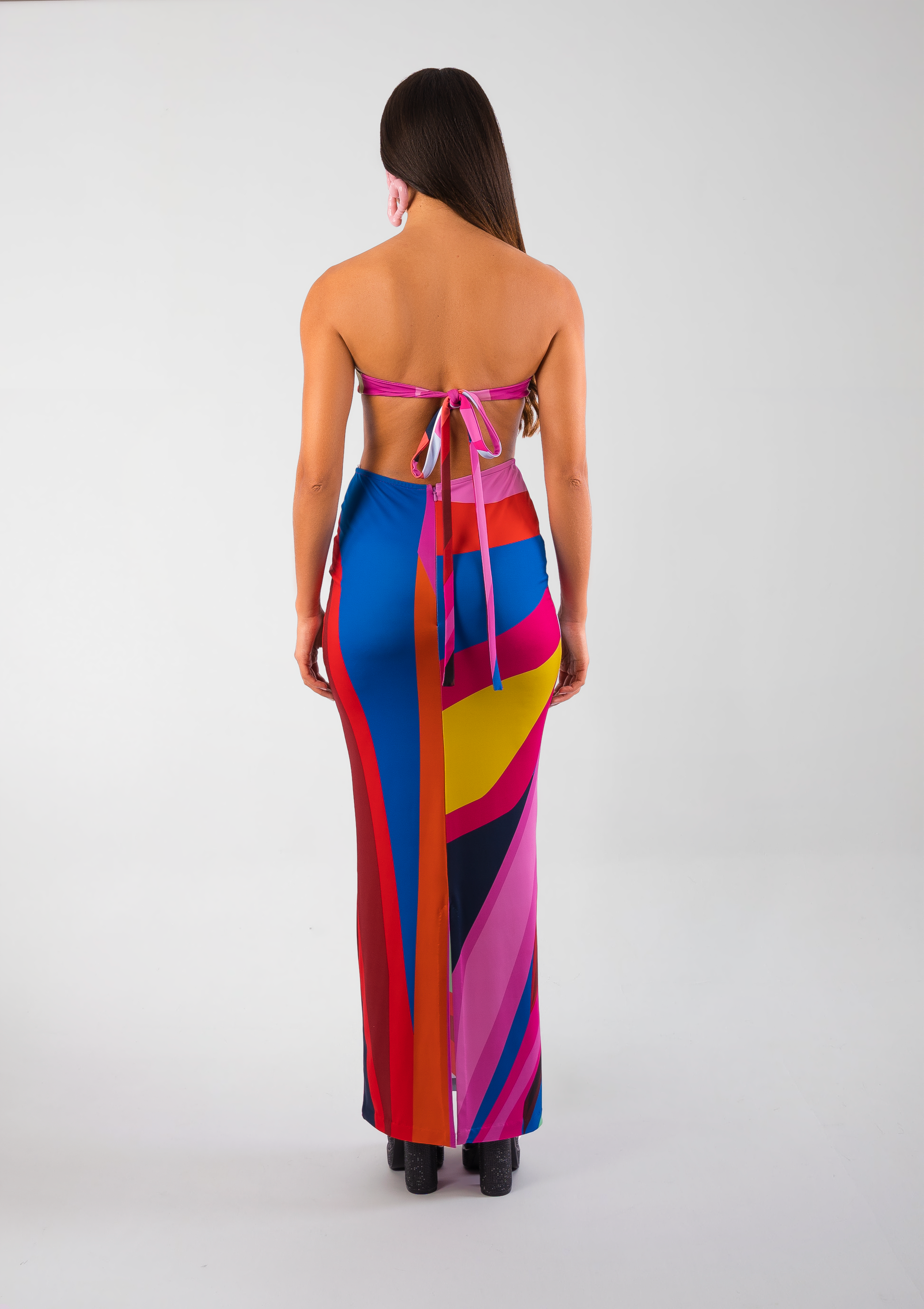 The Tropicana set consists of a beautiful exclusive colourful print. A simple bandeau with a ring detail that is tied from the back and a sexy skirt with a circular cutout that can be tied and adjusted according to how big you like the opening to be. The set is made of stretchy comfortable Lycra that is wrinkle free.